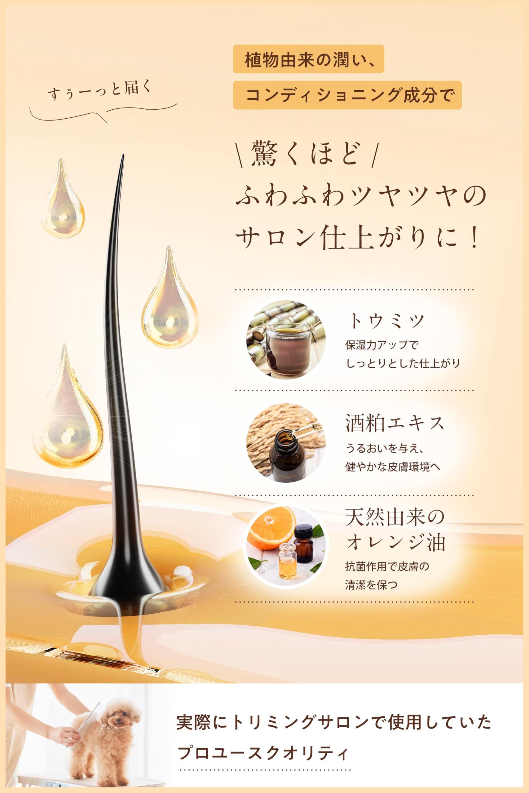 【獣医師監修のこだわり成分で洗いながらスキンケア】 獣医師監修のもと開発された無添加の犬用アミノ酸系シャンプーです。きめ細やかな泡が余分な皮脂や汚れをしっかり落としながら、必要な潤いを守ります。さらに、酒粕エキスやトウミツなどの厳選された天然成分が、皮膚のバリア機能をサポートし、被毛のキューティクルを保護。愛犬の毛並みをふっわふわの仕上がりへ導きます。