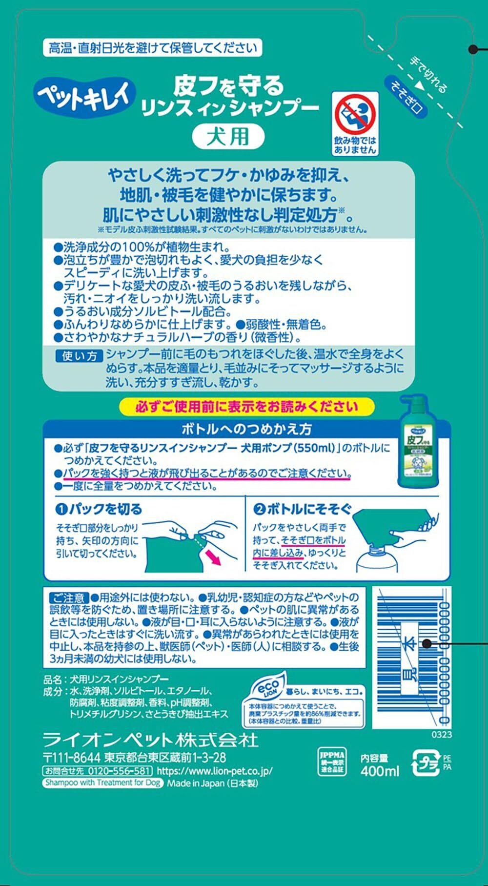 ライオン ペットキレイ 皮フを守る リンスインシャンプー 犬用 つめかえ用 愛犬用 詰替え400ml LIONPET