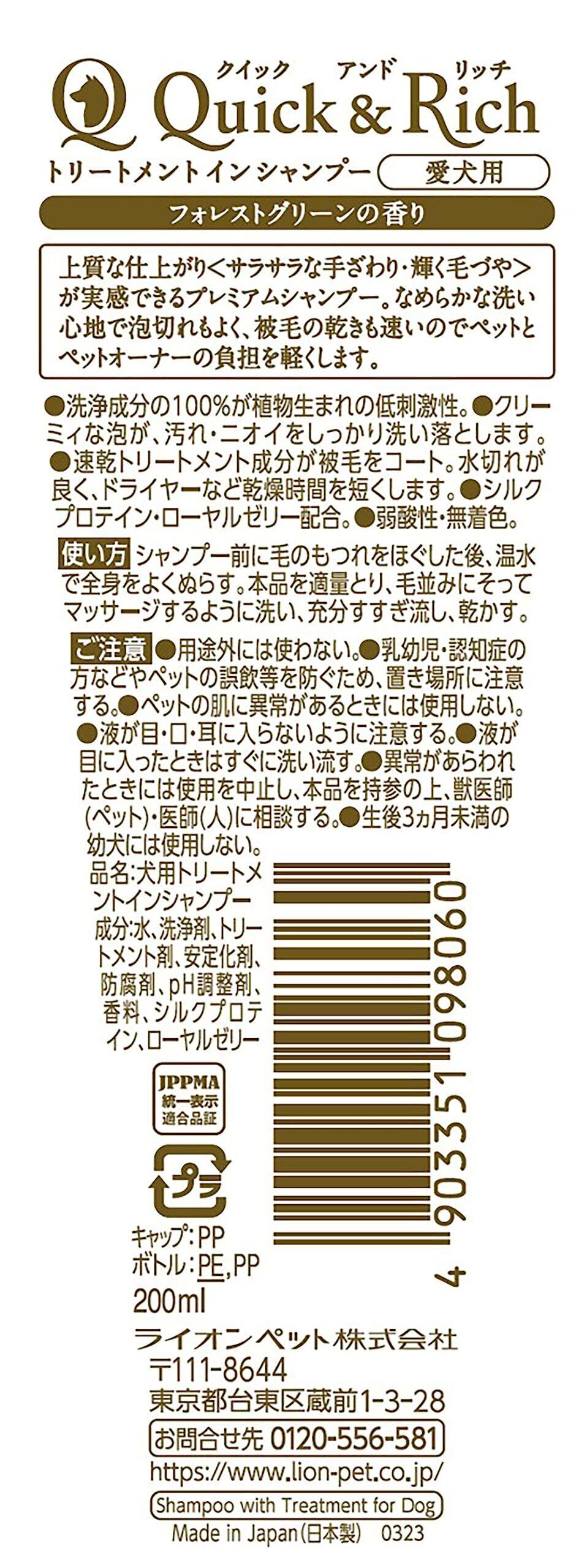 ライオン (LION) クイック&リッチ トリートメントインシャンプー 全犬種用 フォレストグリーン 200ml