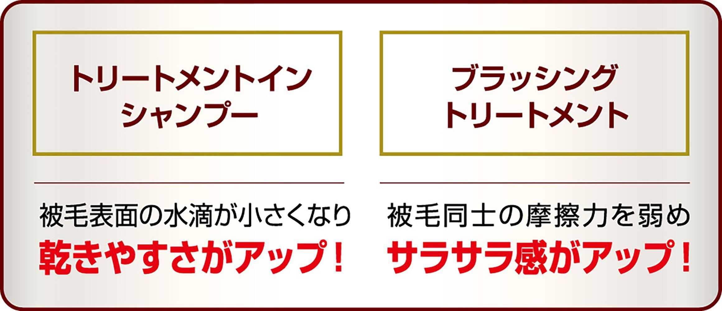 ・なめらかな泡立ちと泡切れよく、被毛の乾きも早いのでペットとペットオーナーの負担を軽くします。 ・上質な仕上がり<サラサラな手ざわり・輝く毛づや>が実感できるプレミアムシャンプーです。 ・洗浄成分の100%が植物生まれの低刺激性。 ・クリーミィでなめらかな泡が、汚れ・ニオイをしっかり落とし、スキッと手早くすすげます。 ・速乾サラつやトリートメント成分が被毛をコートし、タオルドライ時の水切れがよく、ドライヤー乾燥時間を短くします。 ・シルクプロテイン・ローヤルゼリー配合。 ・弱酸性・無着色。 ・Quick&Richブラッシングトリートメントとセットでお使いになるとより効果的です。