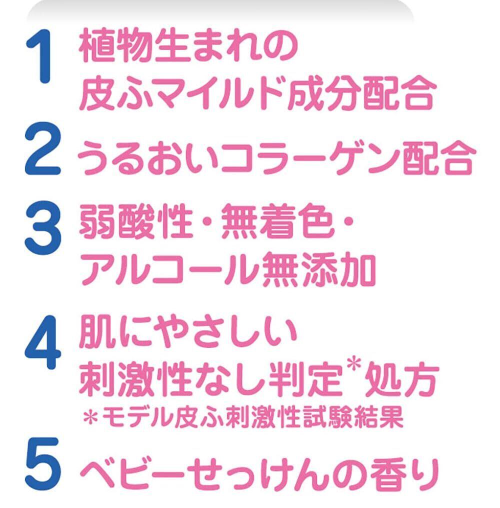 洗う成分の100%が植物生まれ。植物生まれの皮ふマイルド成分配合。アミノ酸系洗浄成分配合。ふんわり泡立ち、やさしく洗い上げます。大切な肌のうるおいを守りながら、汚れ・ニオイを洗い流します。弱酸性・無着色・アルコール無添加。やさしく清潔感のあるベビーせっけんの香り。