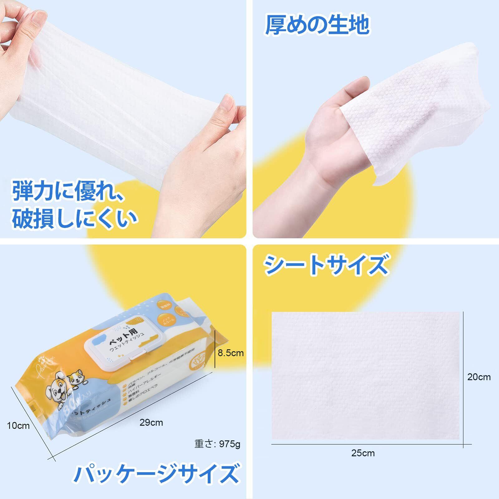 【厚手で大判】:Pawnaxペットウェットティッシュは使いやすいために、厚めの生地を選び、1枚あたり20×25cmでできております。破れにくくて、優れた弾力を持ちながら、たっぷり水分を保ちます。