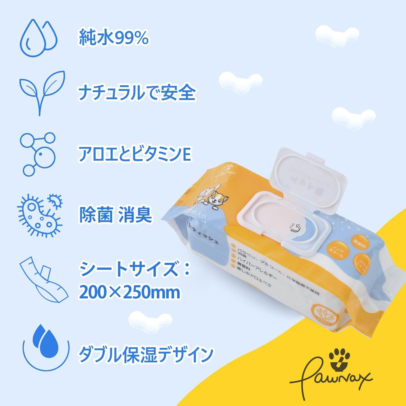 【なめても安心】:Pawnaxペットウェットティッシュはノンアルコール、パラベンフリー、純水99%、無香料タイプです。天然アロエエキス、カミツレエキス、ビタミンEが含まれて、すべて天然成分で、なめられても心配ないです。