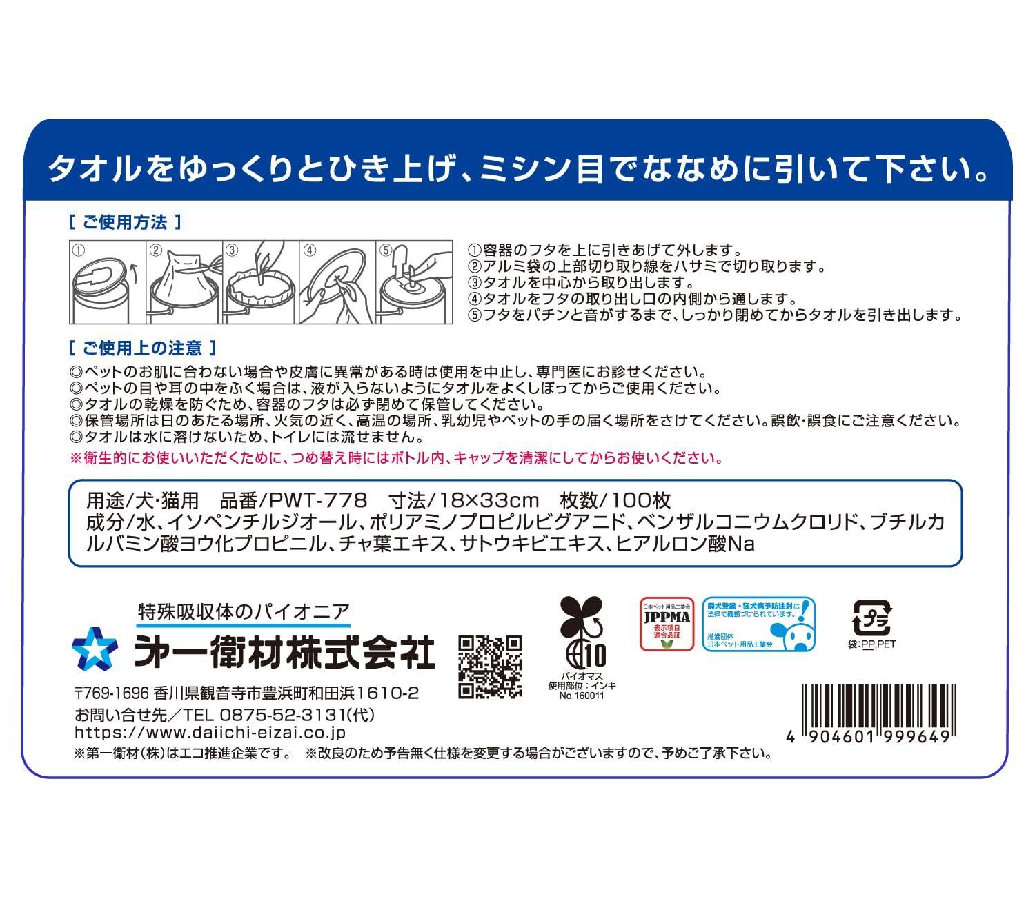 1.容器のフタを上に引き上げて外します。 2.アルミ袋の上部切り取り線をハサミで切り取ります。 3.タオルを中心から取り出します。 4.タオルをフタの取り出し口の内側から通します。 5.フタをパチンと音がするまで、しっかり閉めてからタオルを引き出します。 【保管方法】保管場所は日のあたる場所、火気の近く、高温の場所、乳幼児やペットの手の届く場所を避けてください。 【ご使用上の注意】 ・ペットのお肌に合わない場合や皮膚に異常がある時は使用を中止し、専門医にお診せください。 ・ペットの目や耳の中をふく場合は、液が入らないようにタオルをよくしぼってからご使用ください。 ・タオルの乾燥を防ぐ為、容器のフタは必ず閉めて保管してください。 ・誤飲、誤食にご注意ください。 ・タオルは水に溶けない為、トイレには流せません。 ※衛生的にお使いいただく為に、詰め替え時にはボトル内、キャップを清潔にしてからお使いください。