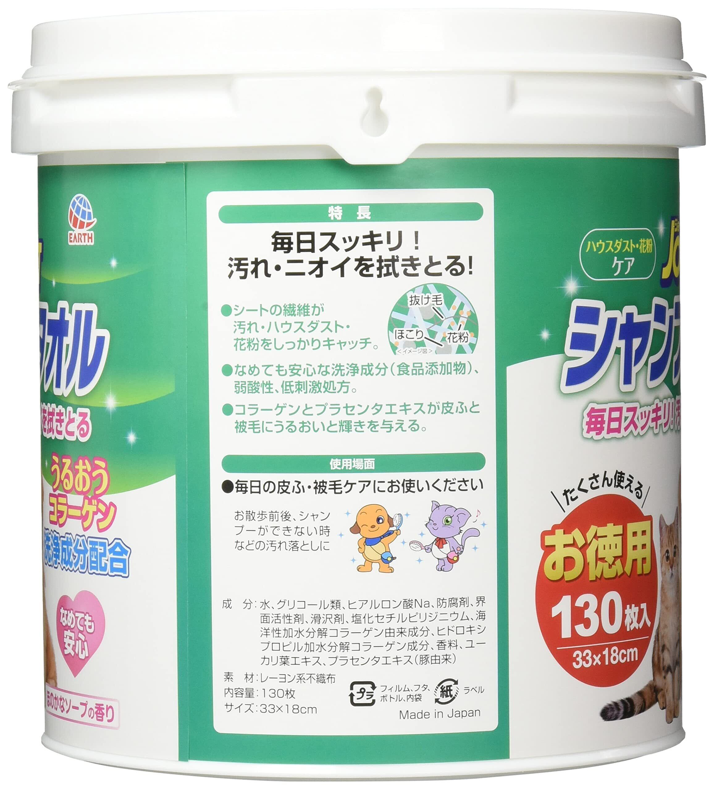 ●毎日スッキリ! 汚れ・ニオイを拭きとる ●シートの繊維が、汚れ・抜け毛・ハウスダスト・花粉などをしっかりキャッチ ●なめても安心な洗浄成分配合(食品添加物) ●コラーゲンとプラセンタエキスのW配合で、皮ふと被毛がうるおう ●ほのかなソープの香り
