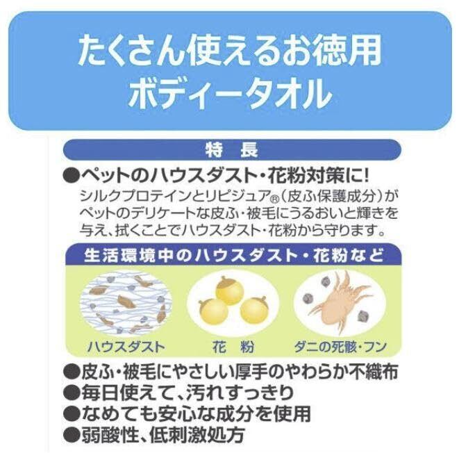 ●ペットのハウスダスト・花粉対策に!●皮ふ・被毛にやさしい厚手のやわらか不織布。●毎日使えて、汚れすっきり。●なめても安心な成分を使用。●弱酸性、低刺激。●ペットの体・手足・口・耳・おしりまわりのお手入れに。