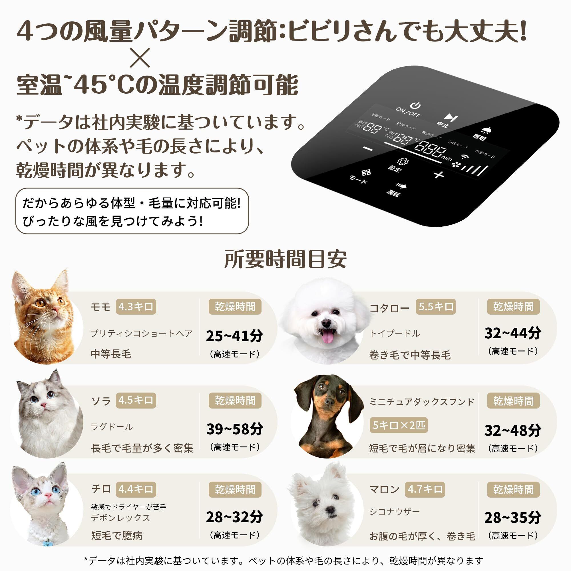 【360°全方位送風ドライヤーハウス】ドライヤーをより効率的に、健康的に、快適にすることを目的に進化されて、床からの温風がペットの体全体を優しく包み込み、360°全方位送風乾きにくいお腹や足、全身しっかり乾燥できるペット用ドライハウスです。ペットにより快適に、上部と下部が同時に送風し、跳ね返って360°送風を実現。大幅な時間短縮を見込め、より早く乾燥させます、愛犬・愛猫の負担軽減にも役立ちます。天候の変化やペットのニーズに応じて、温度(22℃〜45℃)とタイマー(1〜120分)、風量を自由に調節できる仕様となっております。(※遠赤外線)内蔵のPTCセラミックヒーターにより、寒い冬でも設定温度に到達するまでわずか5秒で迅速に暖まります。ボックス内の新鮮な空気、デュアルチャネルの吸気設計、循環空気の70%が乾燥ボックスの温度をより安定させ、新鮮な空気の30%がボックスに導入されて維持されます。ボックスの外側の自然換気により、ペットの呼吸がより快適になります。