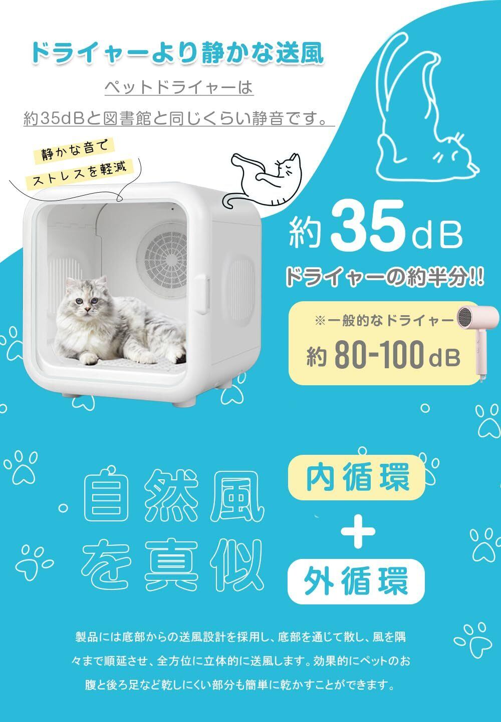 【1台4役で便利に使用】 1.超低騒音ドライヤー:ハウス送風・温風使用時の騒音レベルは約40dBで、ペットに優しく、静かな室内空間を提供します。 2.殺菌&照明機能:ペットのおもちゃや衣類の消毒にも使え、ボックス全体を照らして、ペットが安心できる空間を作ります。飼い主もペットの様子を観察しやすくなります。 3.マイナスイオン機能:花粉や抜け毛を取り除き、毛の広がりや乱れを防ぎ、ペットに滑らかで艶やかな毛並みを提供します。 4.簡単お掃除:犬や猫の抜け毛は背面のダストフィルターに自動的に集まり、お手入れがとても簡単です。