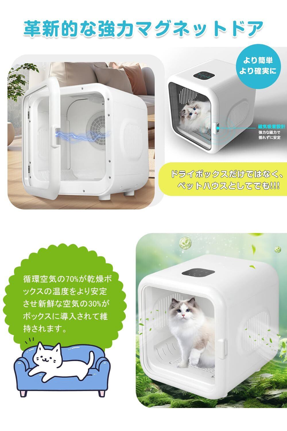 【犬猫兼用・広々とした空間】 62Lの大容量でペットのストレスを最小限に抑え、広々としたスペースを提供します。2匹のペットを同時に乾かすことができ、窮屈さを感じることなく、自由に動き回ることができます。製品サイズは47×43×46cm。耐衝撃性に優れた強化ガラスを使用し、高い透明度を保ちながらも、ペットによる引っかき傷に強いです。
