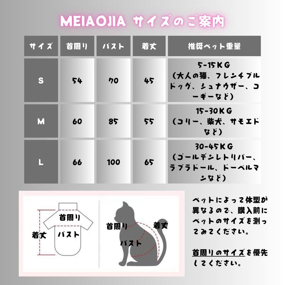 S--着丈<45cm;首周り<54cm;バスト<70cm。5-15kgの成年太い猫、フレンチブルドッグ、シュナウザー、コーギーなどに対応しています。