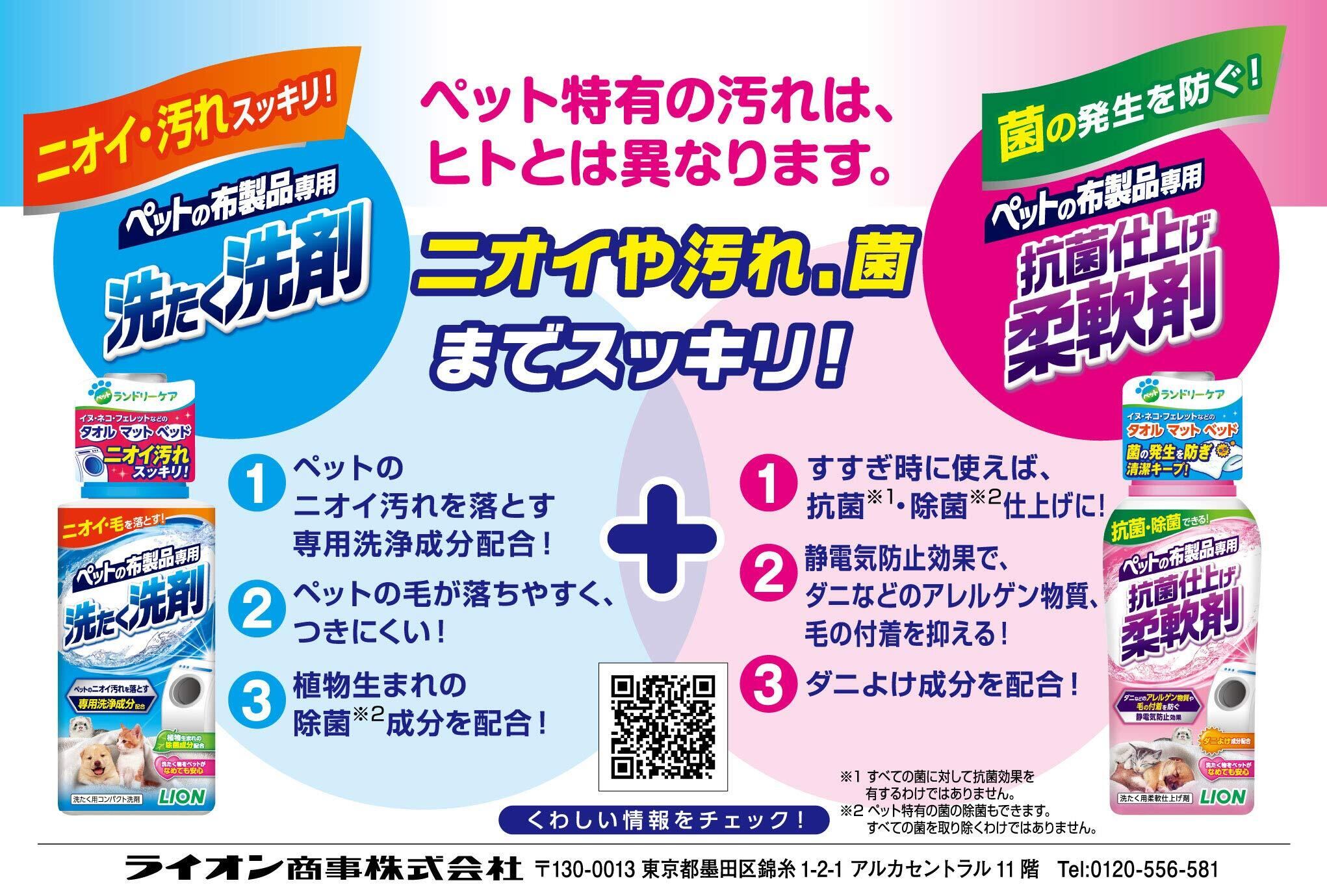 ペットの布製品専用の抗菌仕上げ柔軟剤です。タオル・マット・ベッドなどのお洗濯のすすぎ時に使用することで抗菌・除菌ができる柔軟剤です。ダニなどのアレルゲン物質や毛の付着を防ぐ静電気防止効果とダニよけ成分を配合しているので、布製品をいつも清潔に保ちます。柔軟剤投入口に入れて使用可能です。グリーンフローラルのマイルドな香りです。
