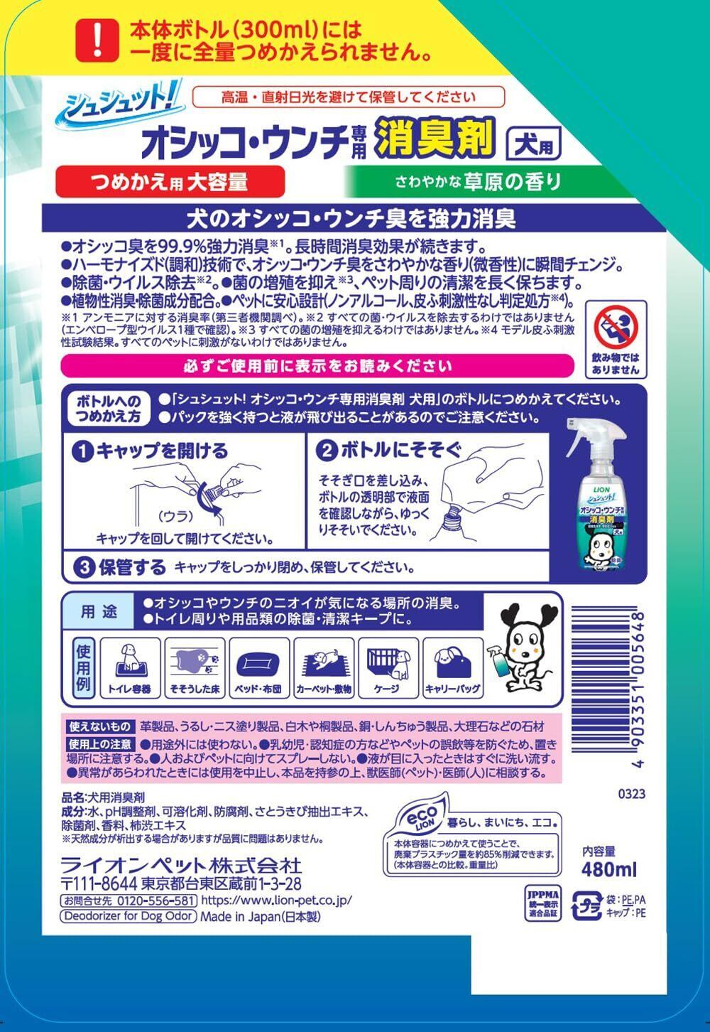 シュシュット! オシッコ・ウンチ専用消臭剤 犬用 つめかえ大容量 480㎖ 約2回分 ライオンペット