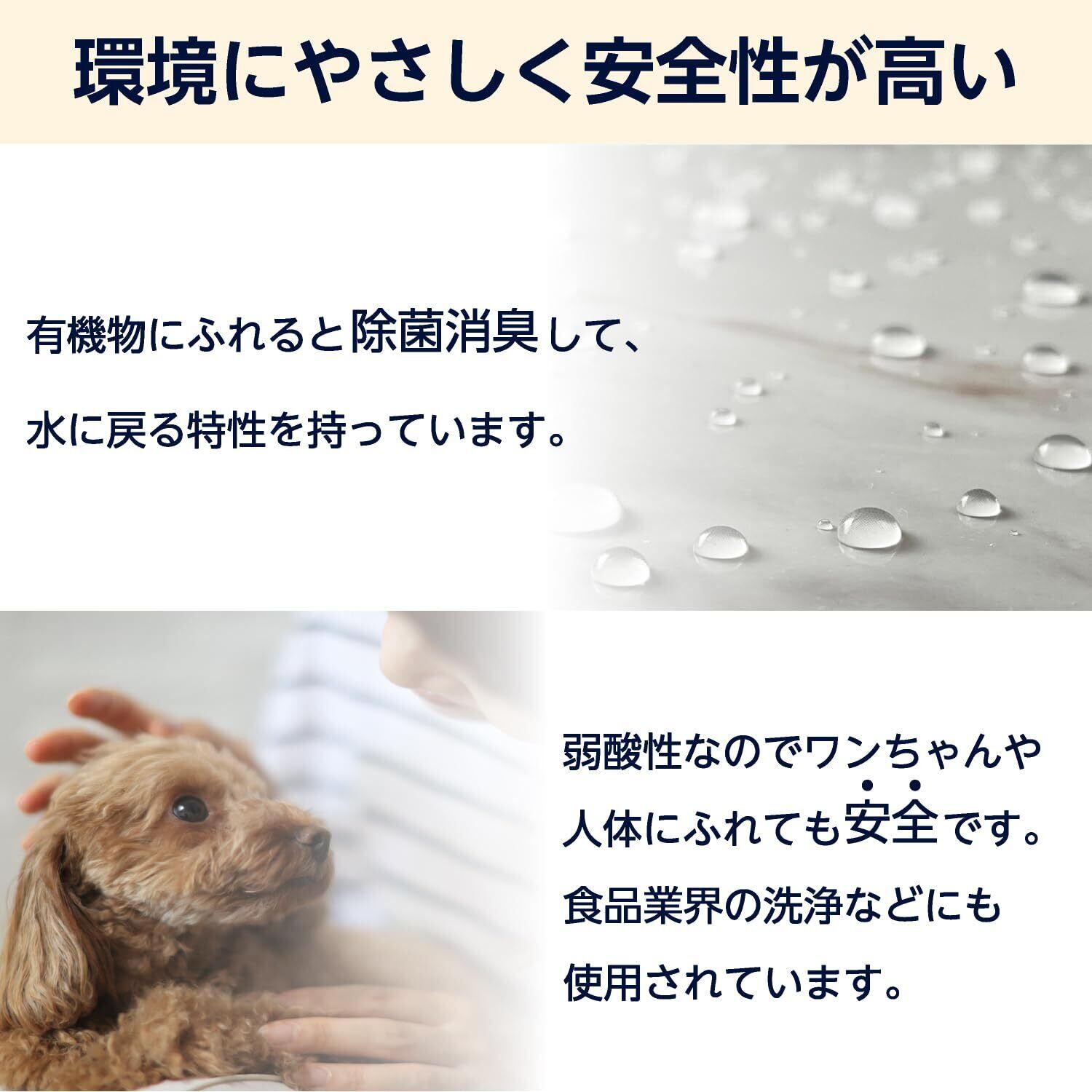 使用上の注意: 他の製品との併用はしない。酸性タイプの製品やアルコールと混ぜない。 人やペットに向けスプレーしない。 子どもやペットが触れない所に保管する。 直射日光や高温多湿を避け、専用のボトルにて使用・保管する。 色落ちやシミの心配がある場合は、目立たないところで試してから使用する。 狭い空間では換気して使用する。 家電、電気製品、照明器具などについた場合はすぐに拭き取る。 必ずスプレーを OFFにして保管する。 ノズルをOFFにしたままスプレーしない。 用途以外に使用しない。