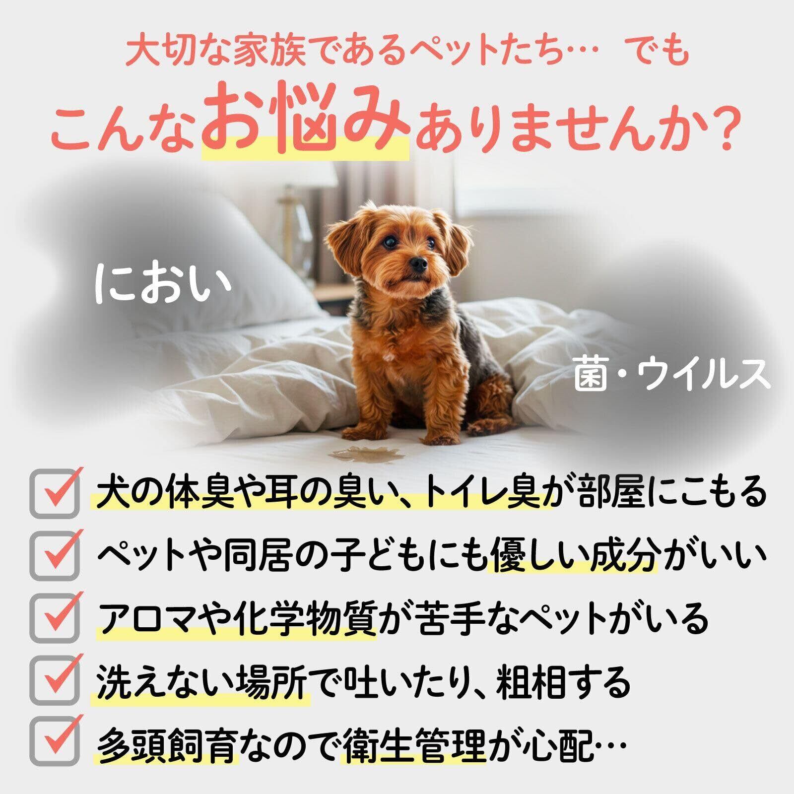 【99.9%の除菌力】化学的に実証された確かな効果でスピード除菌。ペットまわりの衛生 管理に効果的です。特殊な消臭成分配合で、ペット特有の気になるニオイを素早く消臭。