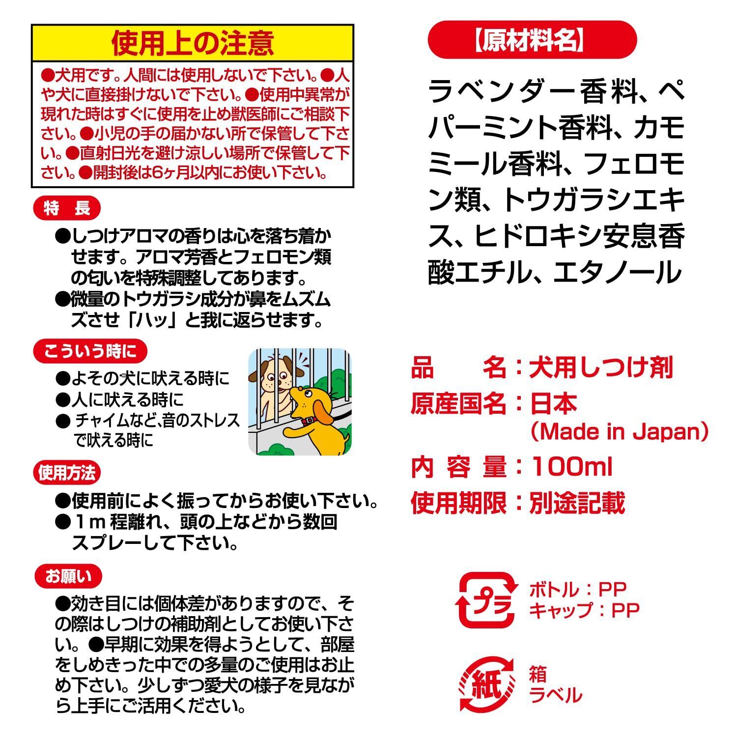 よその犬や人に吠えるときにも最適です。しつけアロマ(芳香とフェロモン類)の香りで興奮をしずめ、むだ吠えを優しく防ぎます。