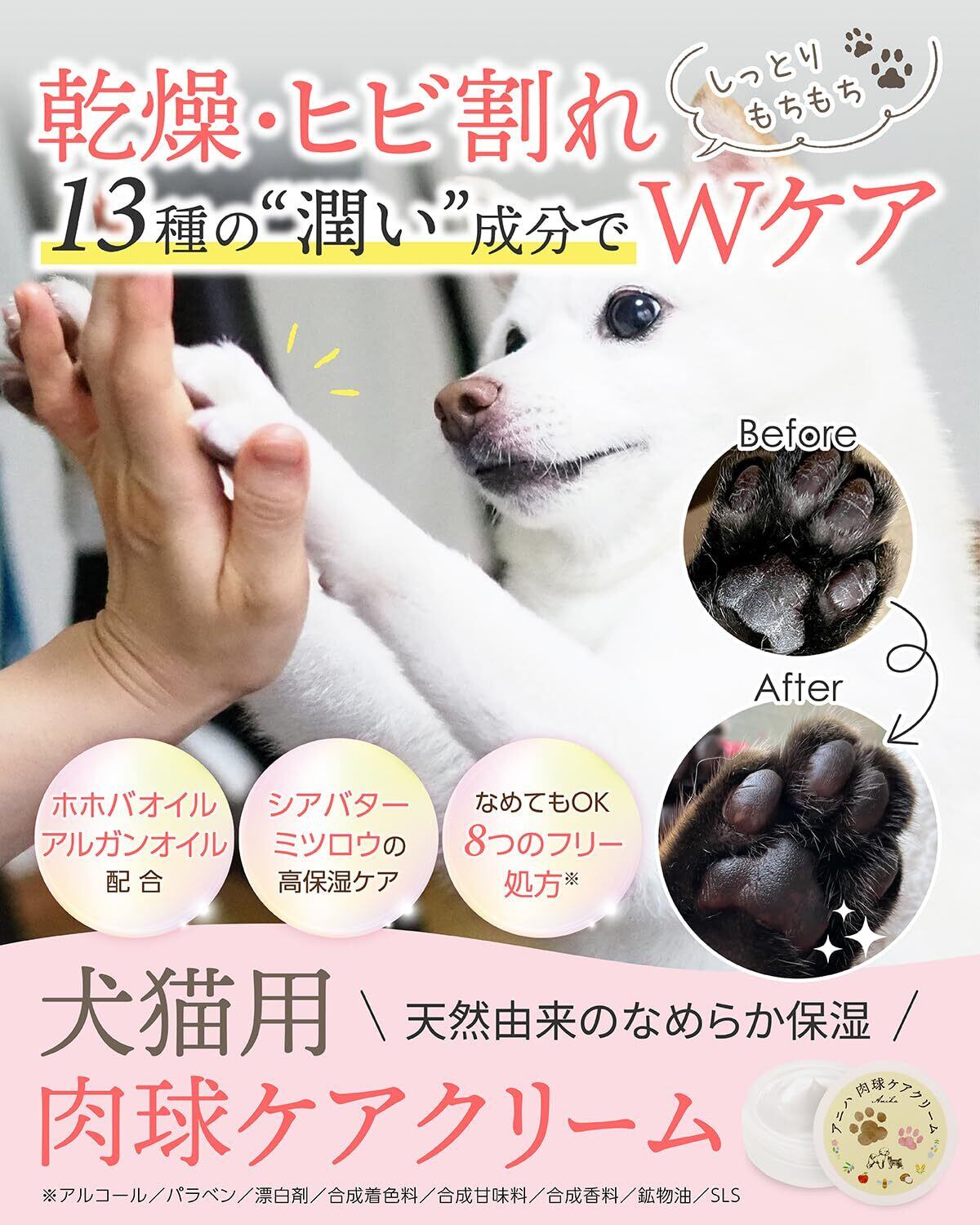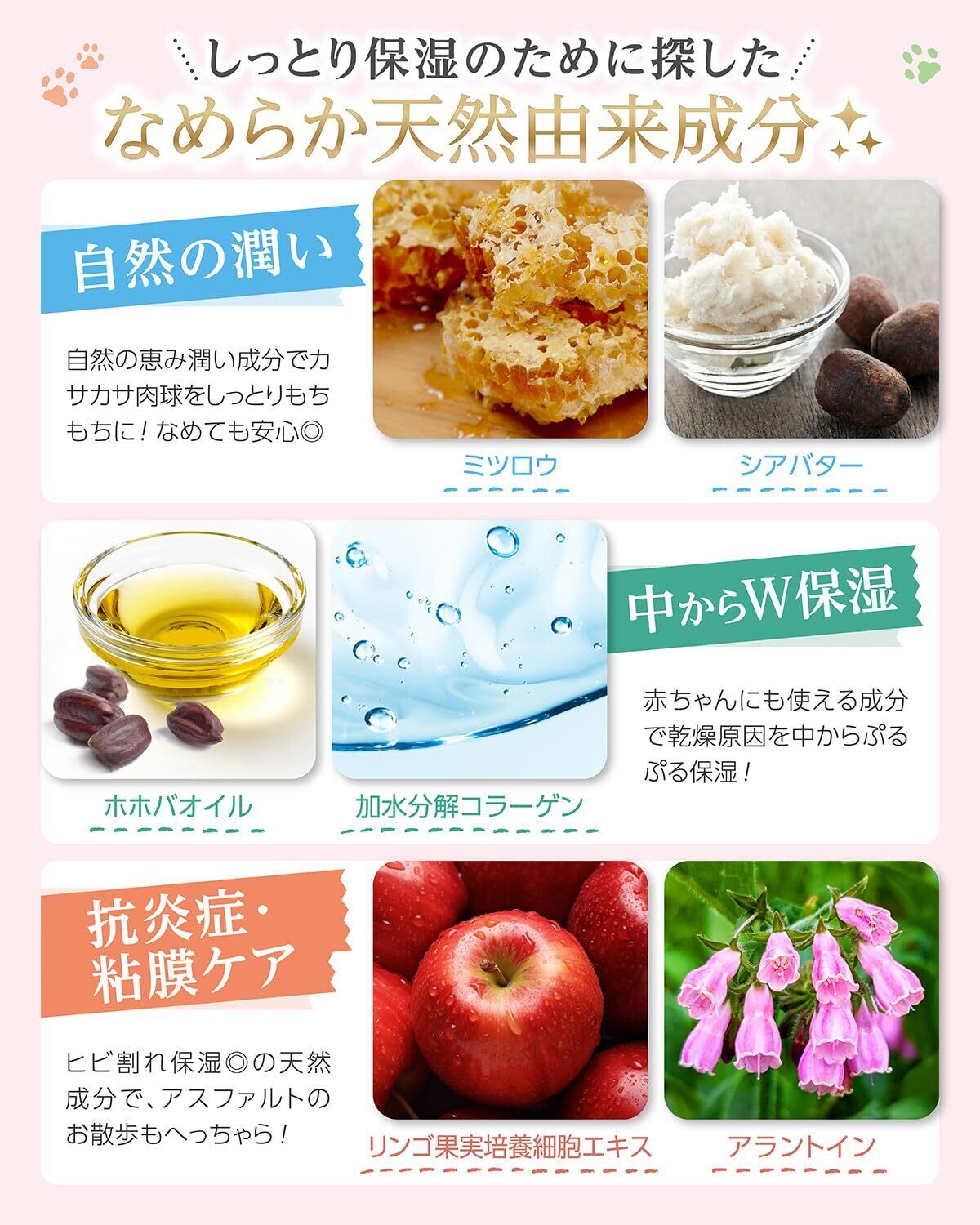 【13種の潤い成分で中からなめらか保湿】 ミツロウ・シアバター・ホホバオイル・コラーゲンなどの保湿成分はもちろん、抗炎症や粘膜ケア効果のあるリンゴ果実培養細胞エキス・アラントインが肉球を中からプニプニなめらか保湿✨