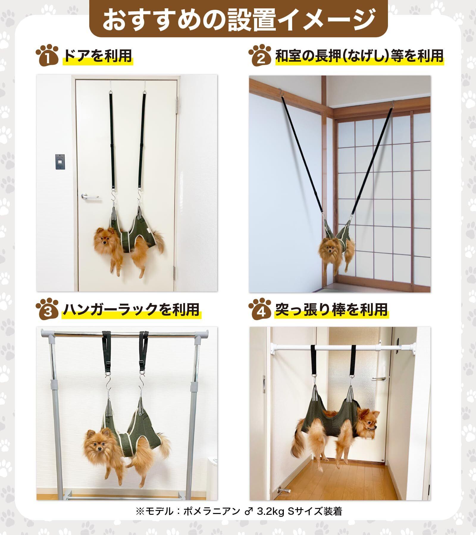 ドア専用フックとロング延長ベルトで、どのご家庭でも簡単・安全に「おうちケア環境」が作れます。ロング延長ベルトは最大1mまで伸ばすことができるので、天井近くの鴨居やドアなど高い位置から吊ってもペットを低い位置に設置でき、万が一の落下事故にも備えることができます。またご家庭にあるハンガーラックや突っ張り棒を利用して吊る方法もおすすめしています。
