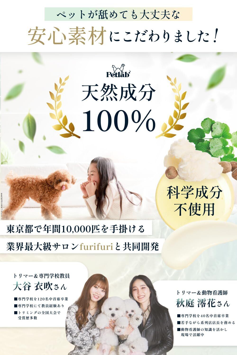 【無臭&天然成分100%で舐めても安心】化学成分を一切使用しておらず、ワンちゃんやネコちゃん、そして飼い主様にも安心してご使用いただけます。無臭仕様でストレスがかからない仕様となっております。