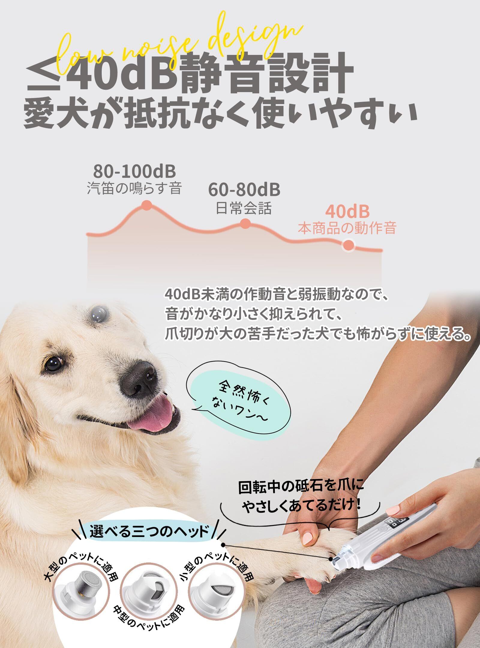【静音設計丨愛犬が抵抗なく使いやすい】犬は音に敏感で、電動爪やすりの音に驚くことがあります。犬 爪切りは40dB未満の作動音と弱振動なので、音がかなり小さく抑えられているため、爪切りが大の苦手だった犬でも怖がらずに使える。