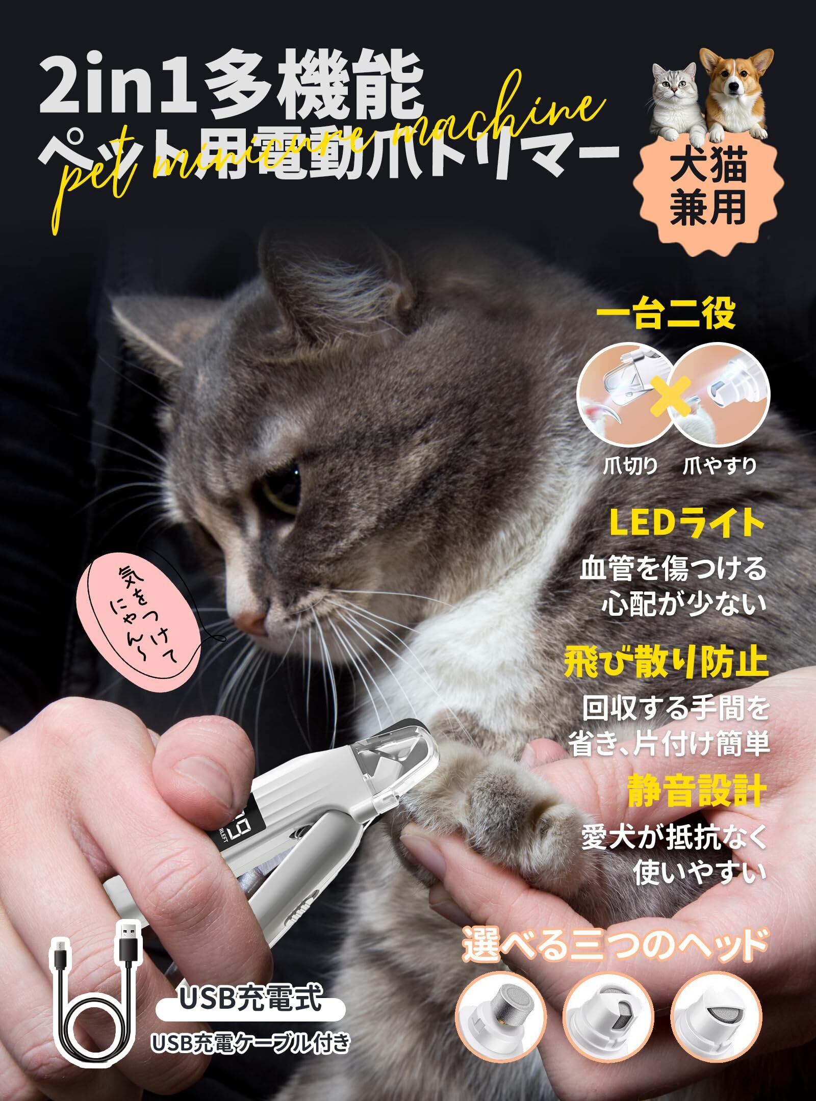 【二重機能丨爪切り&爪やすりを一台で済む】ペットの爪を切ったあと、電動やすりで爪を研ぐことができる2in1ペット用電動爪トリマーです。初心者でもご自宅で簡単にペットのネイルケアができる犬爪切りです。犬 爪切りは人間工学に基づいて、手にフィットするデザインで円弧状の滑り止め持ち手のグリップ感が良く、長時間の使用でも手首の負担になりません。