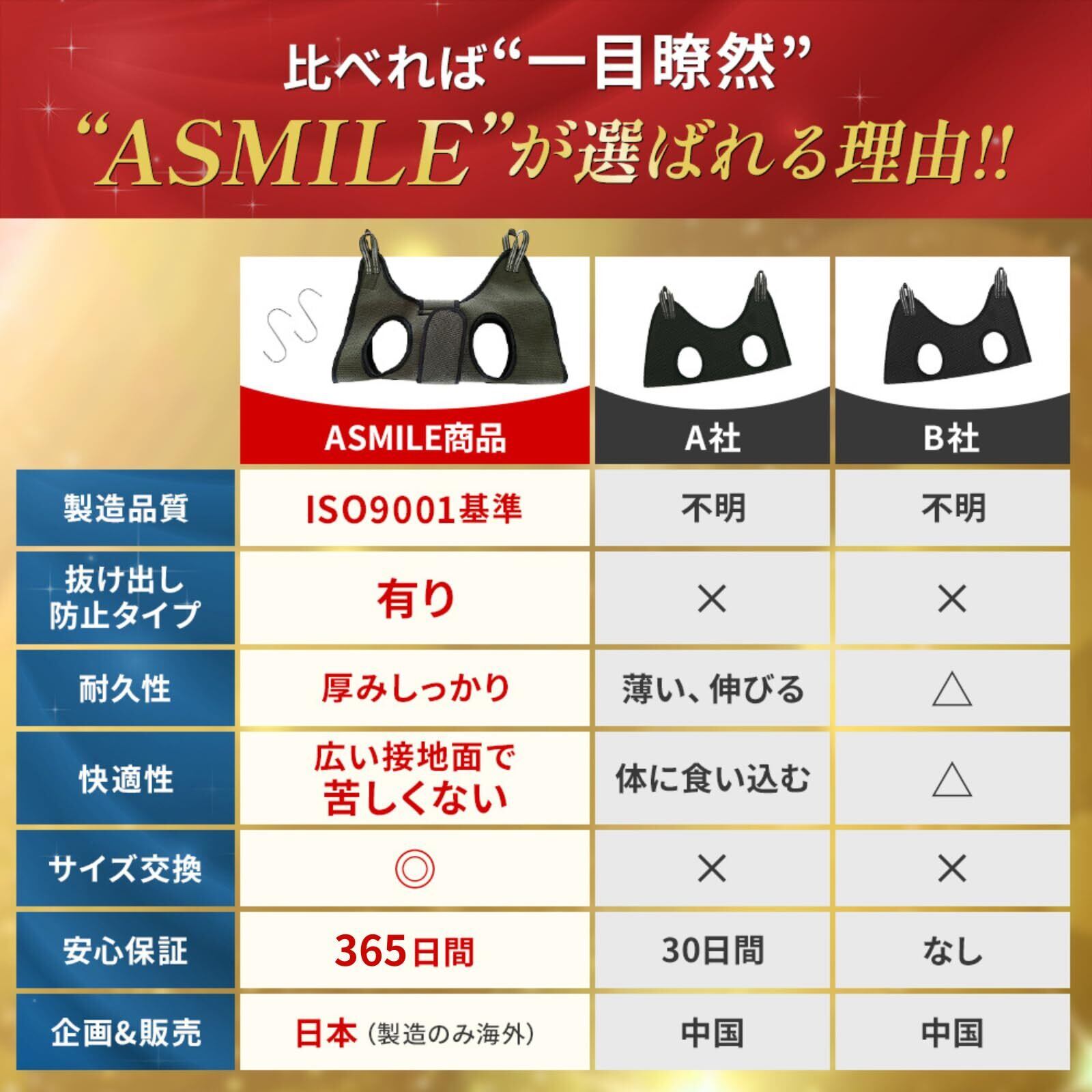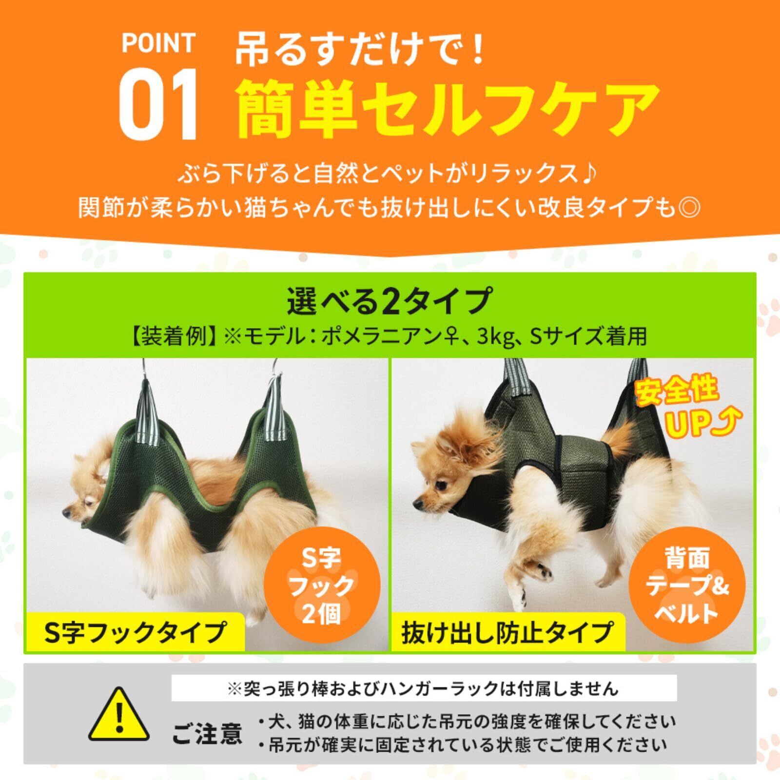 【使い方はカンタン3ステップ】 S字フックを吊元にかけ、本体の向きを合わせて四肢を通します(太い方が頭側) フックタイプ:四隅のベルトを持ち上げて吊るす 抜け出し防止タイプ:背面テープとベルトを留めてから吊るす(締めすぎに注意) 安定していれば設置完了。お手入れスタート!