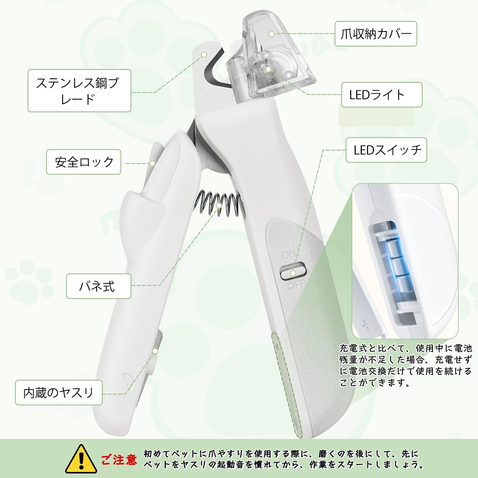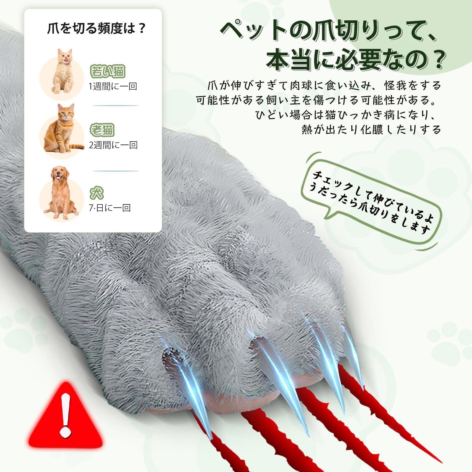 【LED ライト補助で、操作が正確且つ安心】 本猫つめきりは便利な LED ライトを装着しており、ペットの爪の位置を素早く正確に把握でき、血行のある部分(血線)を切ることによるペットの負傷を回避できます。小型・中型・大型のペットの爪切りニーズにも対応しています。