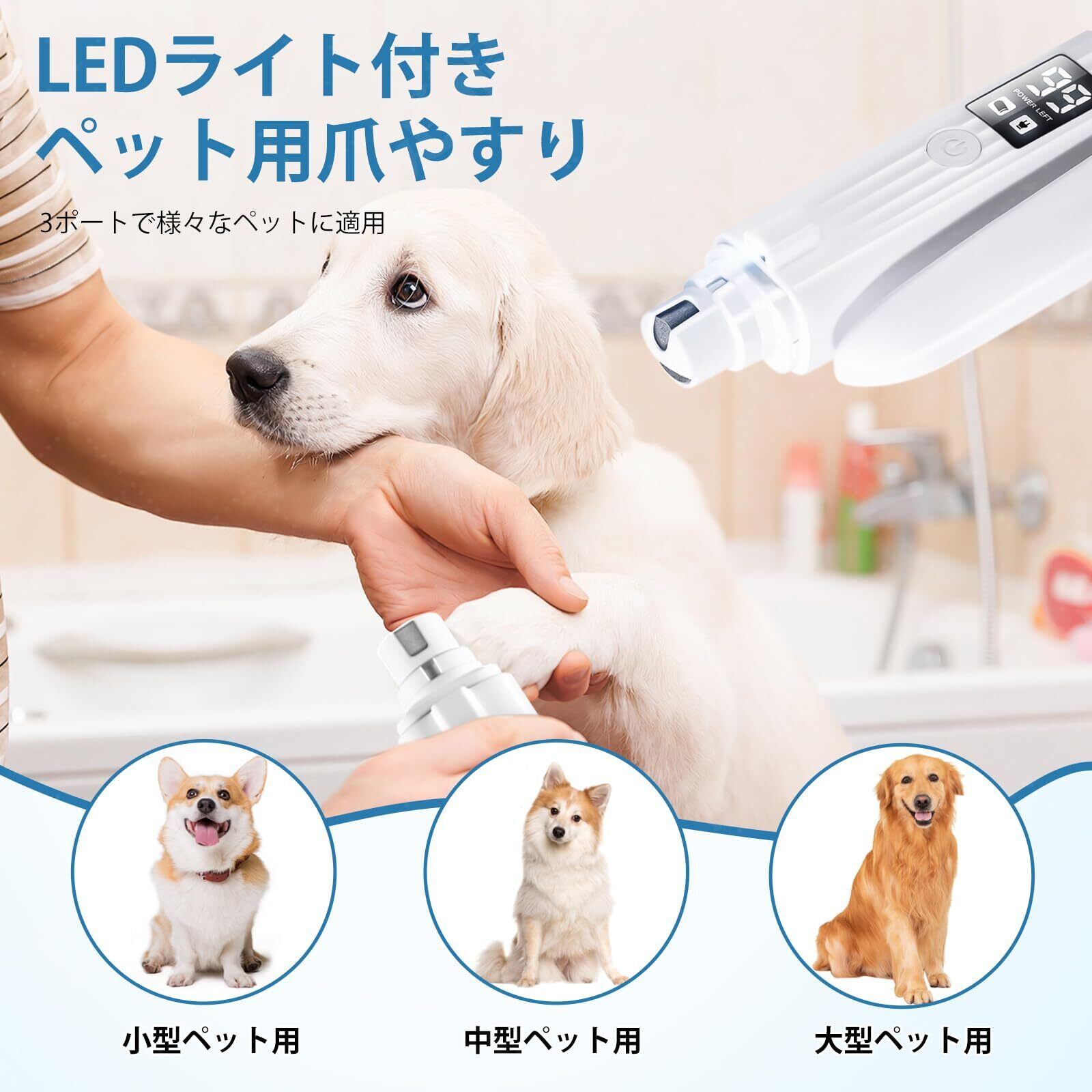 ペット用爪切り 電動爪トリマー 犬用 猫用 LEDディスプレイ表示 LEDライト付き 爪研ぎ器 大容量バッテリー USB充電式 コンパクト 切りやすい すぎ防止 怪我防止 飛び散り防止 安全で低騒音 電動爪やすり 爪削り 高速回転 掃除簡単 小中大型ペット