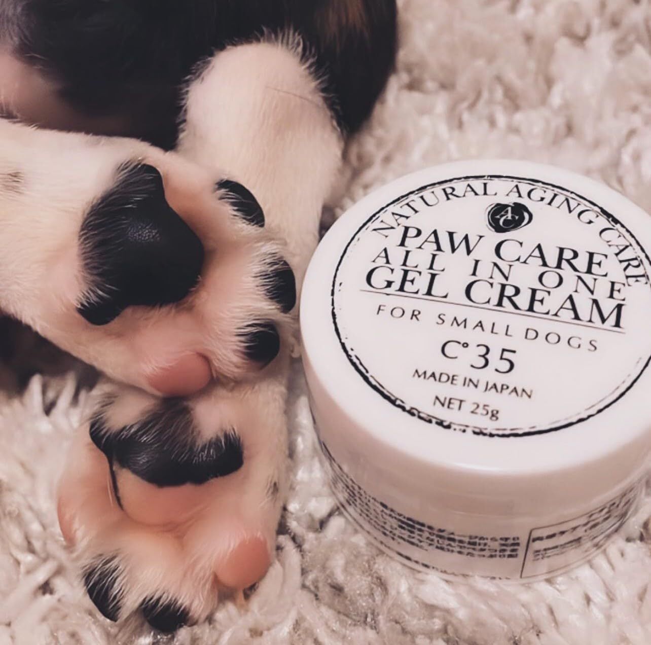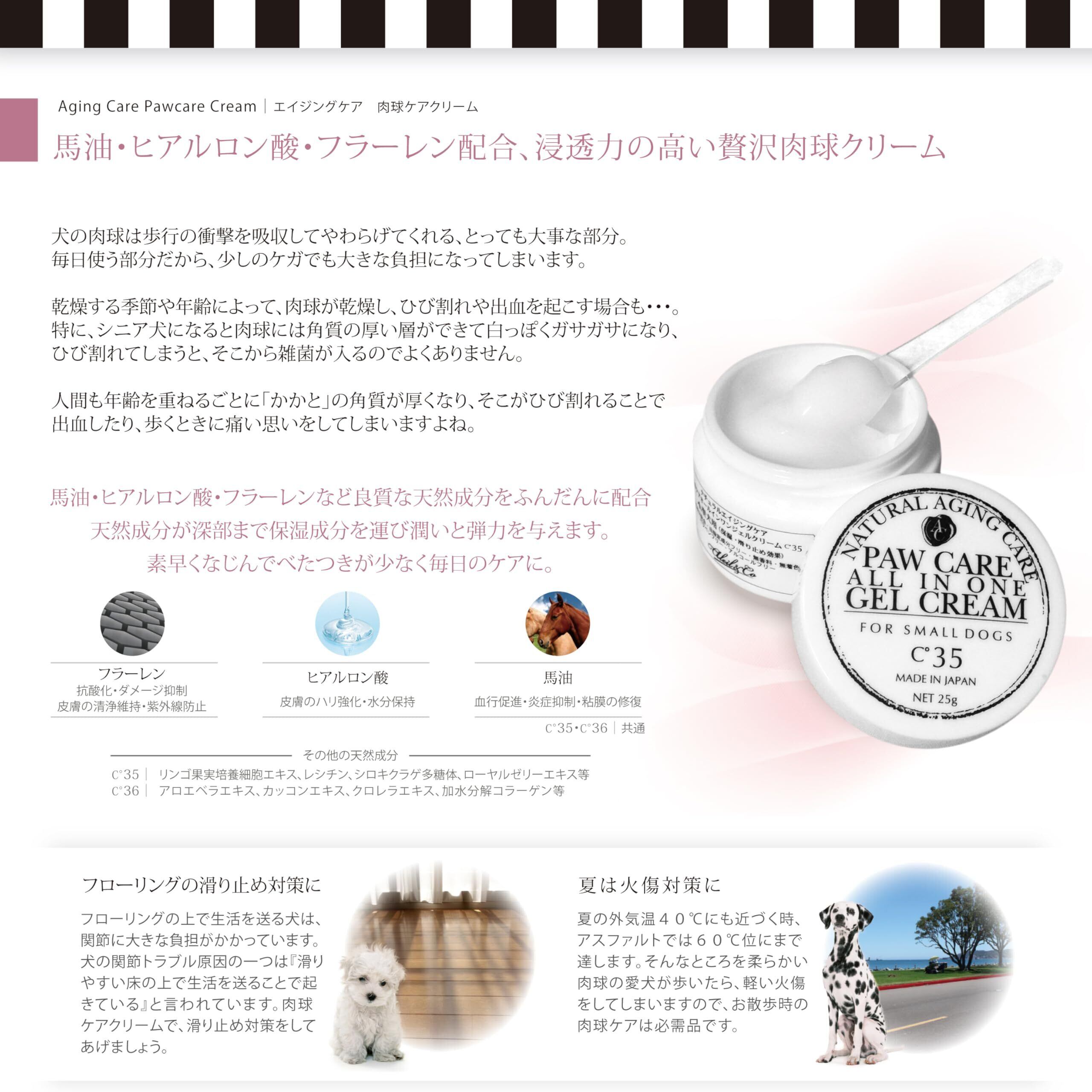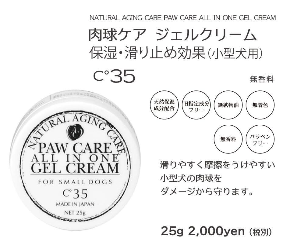 [Natural Aging Care Series]ナチュラルエイジングケア パウケアオールインワン ジェルクリームC35 /25g(滑り止め・保湿) 滑りやすく摩擦をうけやすい小型犬の肉球をダメージから守ります。 浸透力の高いジェルクリームが深部まで栄養を届け、天然保湿成分が滑り止め効果をもたらし、すばやく馴染んでべたつきません。 フラーレンやQ10などのエイジングケア成分をたっぷり配合、パピーのような柔らかな肌に。 天然成分配合・ノンシリコン・旧指定成分フリー・PEGフリー・ラウリル硫酸ナトリウムフリー・無鉱物油・無着色・無香料・アルコールフリー・パラベンフリーです。 【ご利用方法】真夏や真冬のお散歩は特に肉球への負担が増えます。お散歩後や、朝晩の肉球のお手入れに適量を塗り込んでください。 【使用上の注意】犬の皮膚に合わない場合はご使用をお止めください。使用後は必ずふたをして直射日光をさけて保管してください。極端に高温、または低温の場所で保管されますと変色や濁り等が生じることがありますが品質に問題はございません。乳幼児の手の届く場所には保管しないでください。