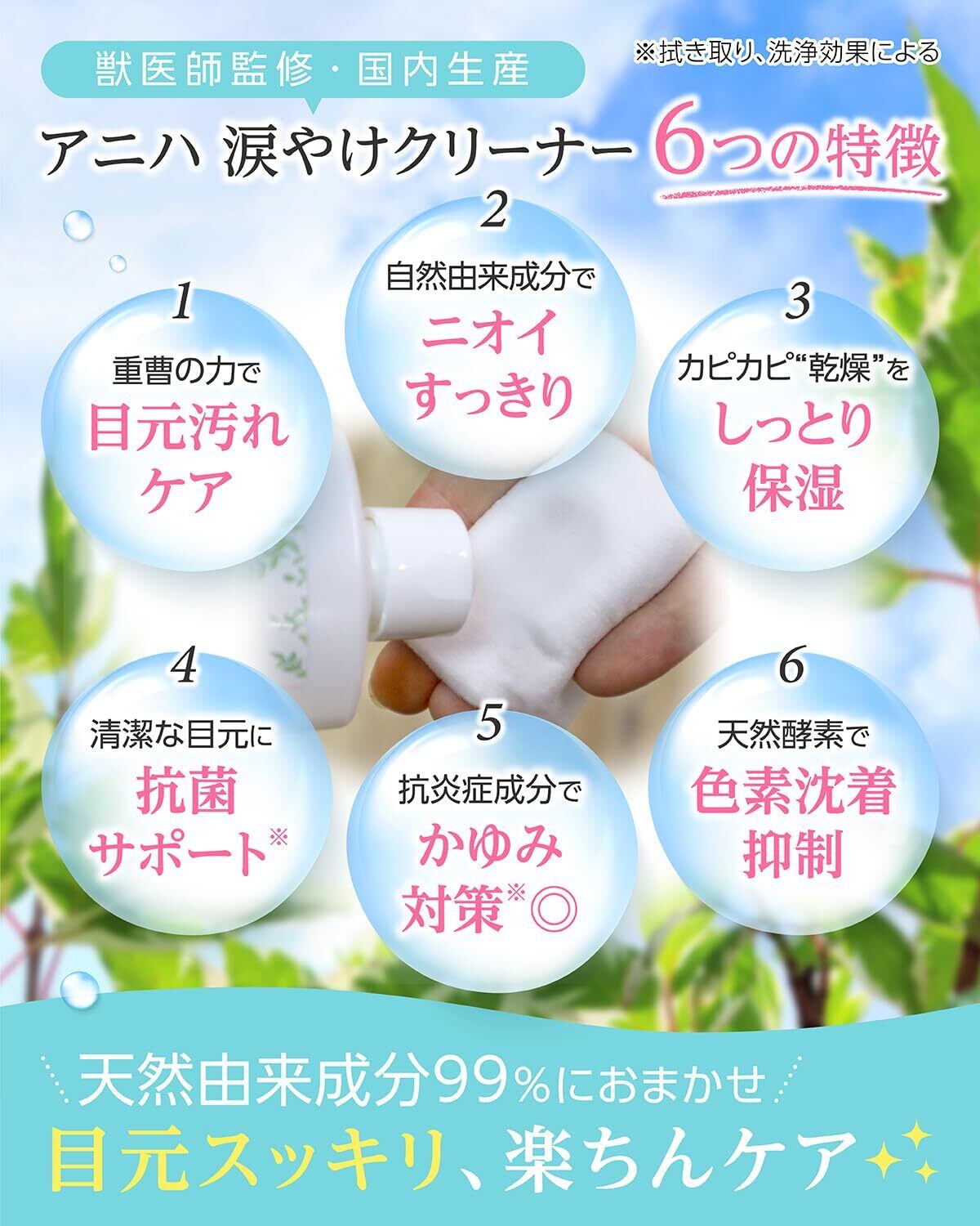 アニハ 犬猫用“天然由来成分99%”涙やけクリーナー【獣医師監修】メグスリノキエキス配合 洗浄・消臭抗菌・色素沈着抑制 低刺激タイプ100ml