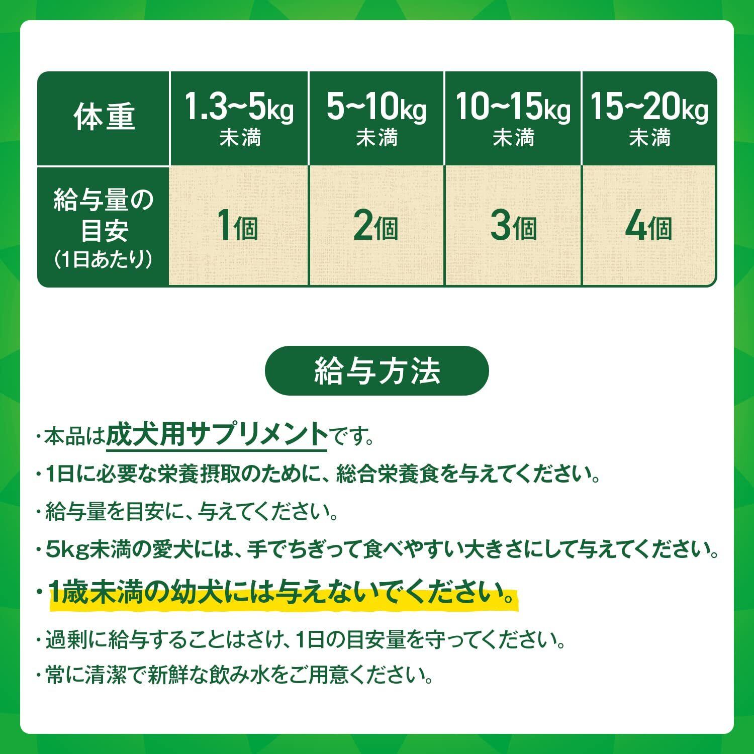 体重1.3~5kg未満:1個、5~10kg未満:2個、10~15kg未満:3個、15~20kg未満:4個 5kg未満の愛犬には、手でちぎって食べやすい大きさにして与えてください。1歳未満の幼犬には与えないでください。過剰に給与することはさけ、1日の目安量を守ってください。常に清潔で新鮮な飲み水をご用意ください。