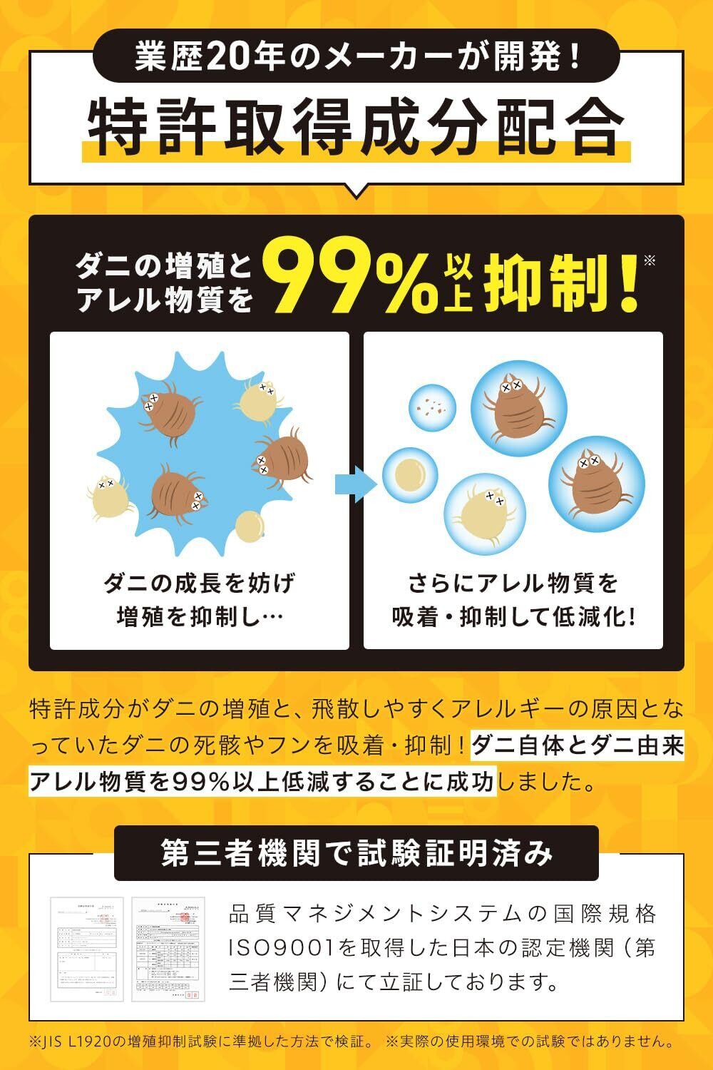 【アレル物質を99.8%※低減!増殖抑制99.9%!快適な空気環境をサポート】 ダニそのものよりも、不快感を引き起こす主な原因は“ダニの死骸”や“フン”であると言われています。とくにフンには消化酵素などのタンパク質が含まれており、これらが乾燥して空中に浮遊すると、鼻や喉、皮膚に反応を起こす可能性があると言われています。本製品にはアレル物質と結合し、その構造を変化させる独自成分を配合。IgE抗体と結合しにくくなることで、反応の引き金となるリスクを抑える設計になっています。アレル物質対策としても、すでにダニに悩まされている方の「今ある不安」と、今後の「予防」の両面に寄り添う製品です。チリダニなどの死骸やフンが原因とされる、くしゃみ・鼻水・目のかゆみ・咳などの対策にお役立ていただけます。 ※第三者機関による評価試験データに基づく