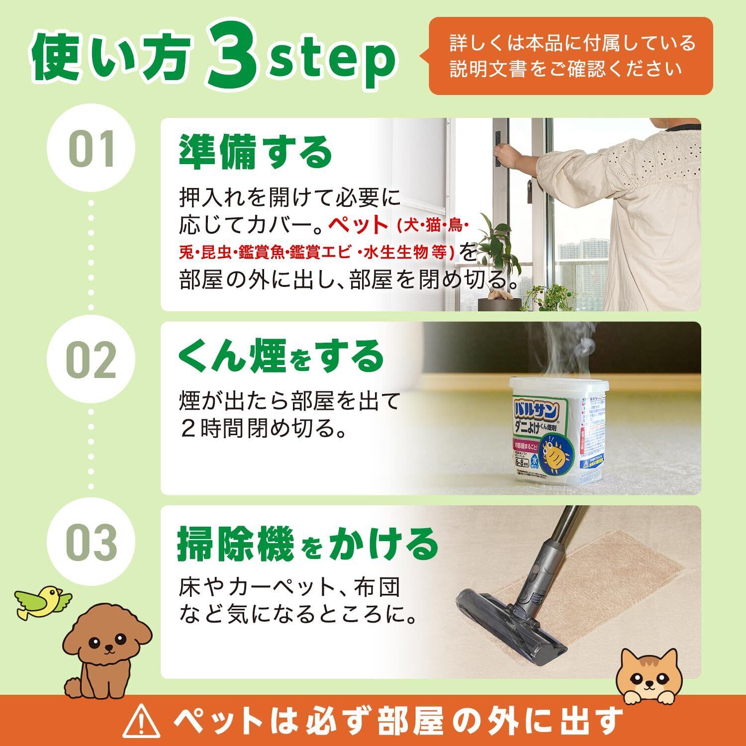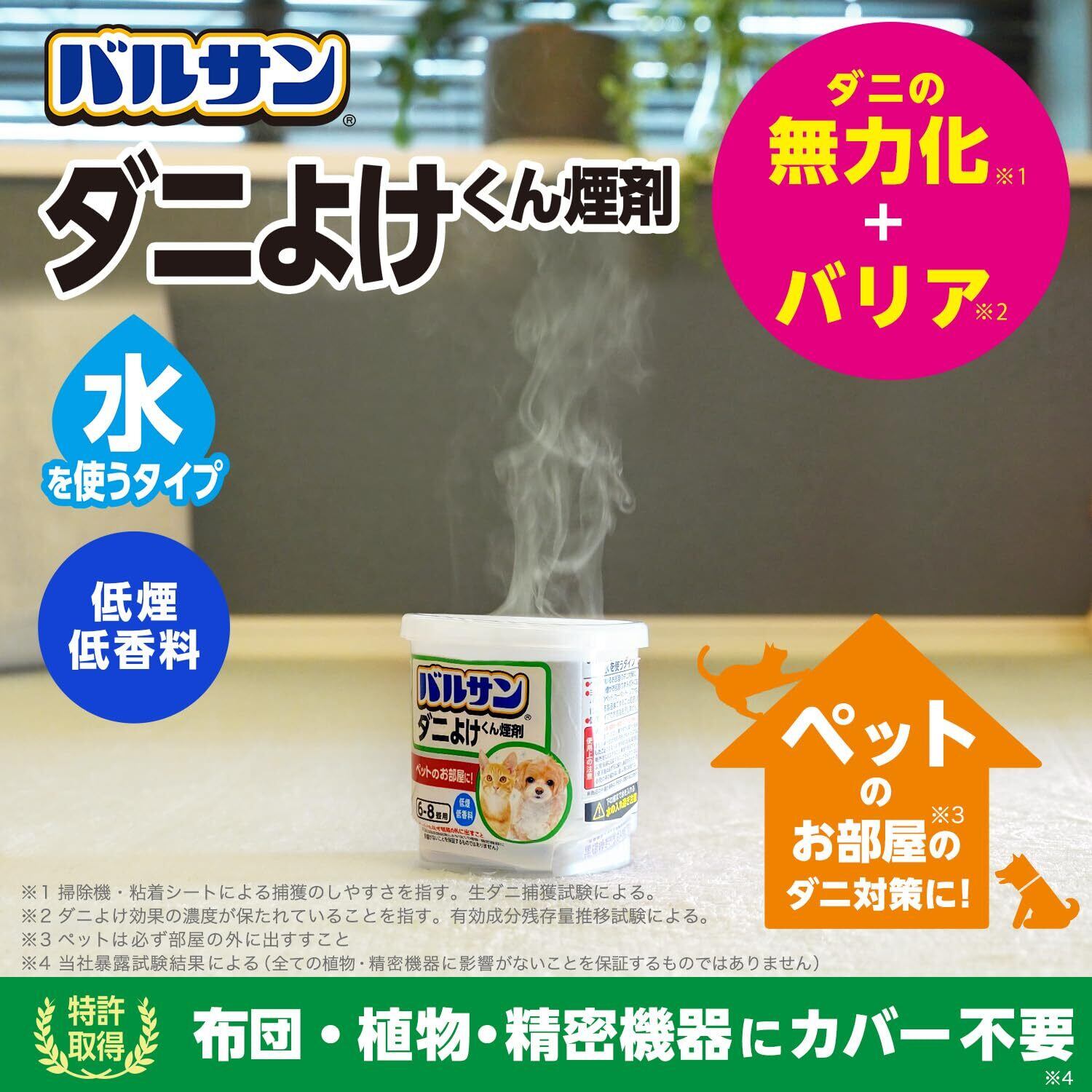 ●ペットのいるお部屋のダニ対策用くん煙剤です。植物・精密機器へのカバー不要のラクラクタイプです。