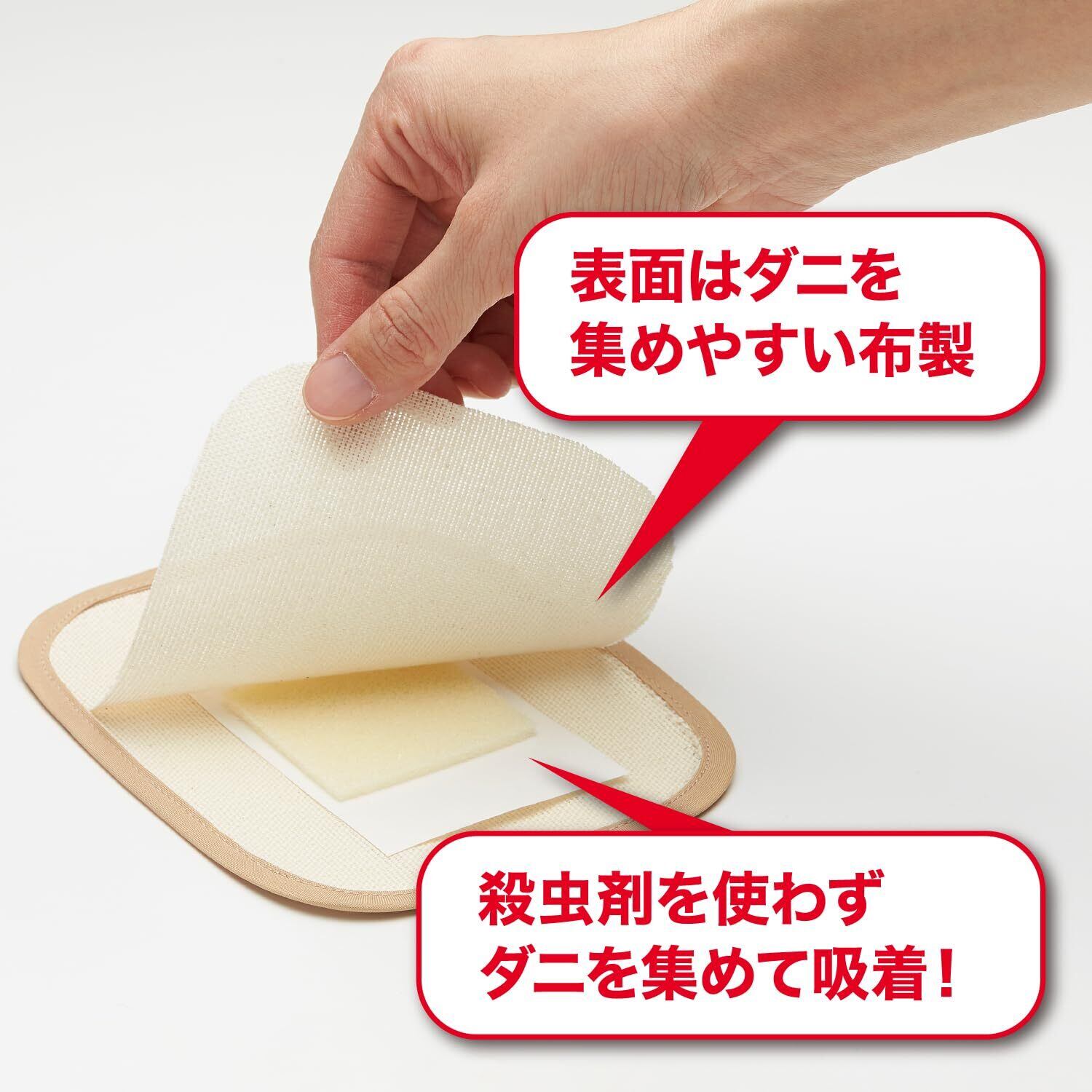 ●特殊誘引剤(マイクロカプセル化フルーツエキス:食品用基材)に誘われたダニが、パイル状綿生地に入り込み、強力粘着剤(食品用基材)に吸着して死滅する新しいタイプのダニ対策商品