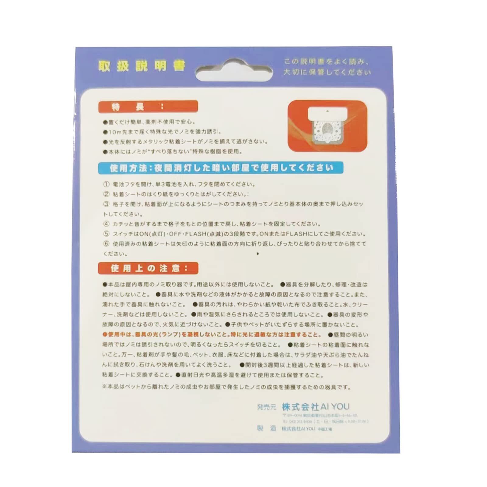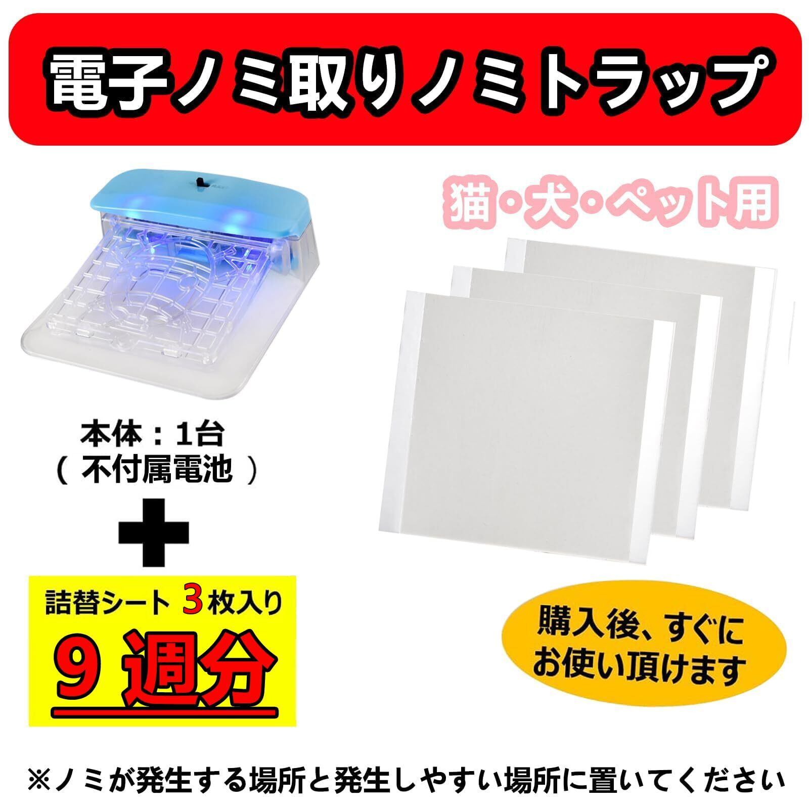 【商品説明】◆電子ノミ(本体)・本体器具1台※電池は付属しておりません(乾電池2個は自分で購入必要);◆電子ノミ交換用粘着シート・3枚入◆粘着シートの交換基準は約3週間 ;◆スイッチはON(点灯)、OFF(消灯)、FLASH(点滅)の3段階に分かれているので、実際の状況に合わせて使用してください。