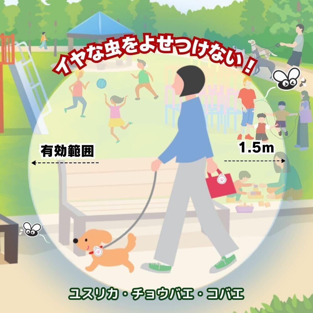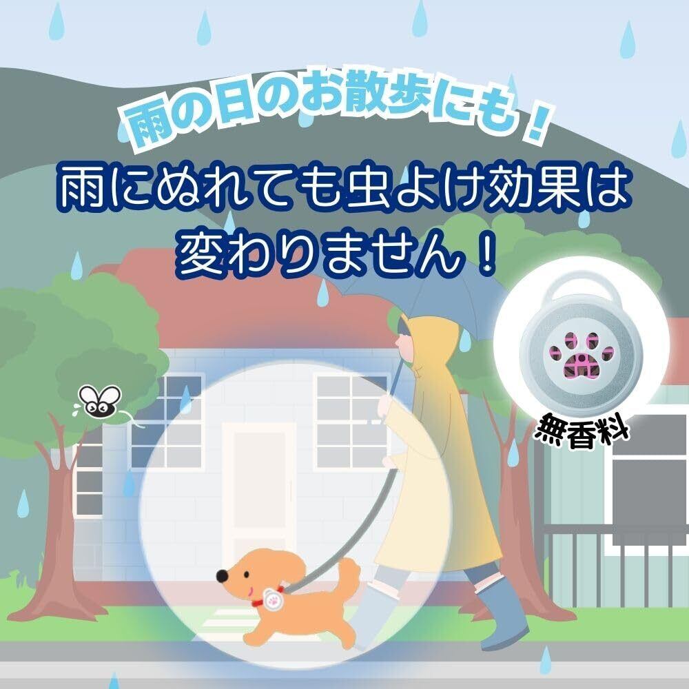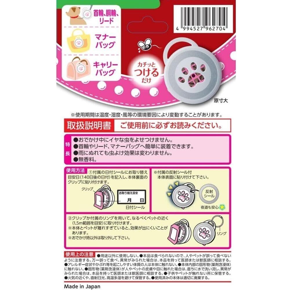 ● おでかけ中にイヤな虫をよせつけません。 ● 首輪やリード、マナーバッグへ簡単に装着できます。 ● 雨にぬれても虫よけ効果は変わりません。 ● 無香料