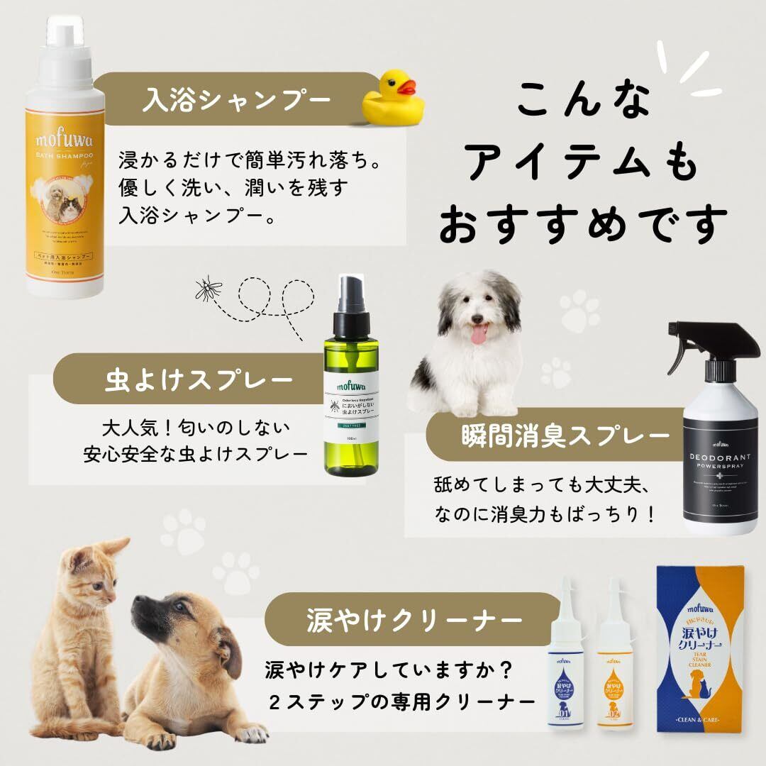 ディート不使用で、わんちゃんや猫ちゃんにも安心!mofuwa虫よけスプレーは安全性の高いメンタンジオールを使用。わんちゃんや猫ちゃんがいる空間にも安心してお使いいただけます。