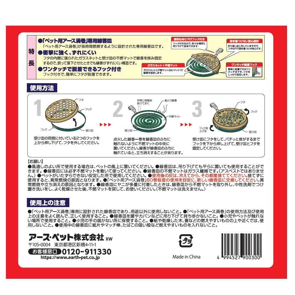 「ペット用アース渦巻」専用線香皿! アース・ペット ペット用 アース蚊とり線香皿 吊り下げ式 対象 犬、猫など 特長 ●「ペット用アース渦巻」が長時間燃焼するように設計された専用線香皿です。 ●フタの内側に張られたガラスネットと受け皿の不燃マットで線香を挟み固定するので、誤って落下させたときでも線香がずれにくい構造です。 ●フック付きで、簡単にフタが脱着できます。 ●線香皿は、吊り下げても平らに置いても使用できます。 数量 1器 原産国 中国 ご注意 ※本品はペット用アース渦巻専用の線香皿です。目的以外の用途では使用しないでください。 ※線香皿の不燃マットはガラス繊維です。アスベストではありません。