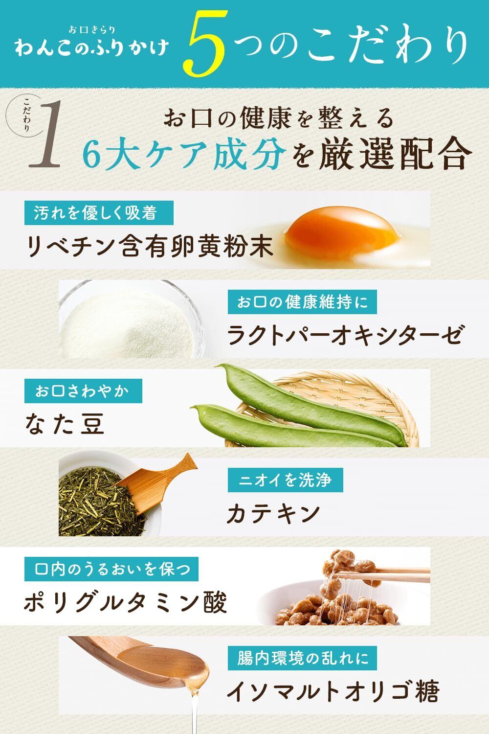 【歯周トラブルに6大成分】3歳以上のわんちゃんの80%以上が歯周トラブルを抱えています。わんこのふりかけは食べるだけで口臭・歯垢ケアできるように、こだわりの6大お口ケア成分を配合しました。
