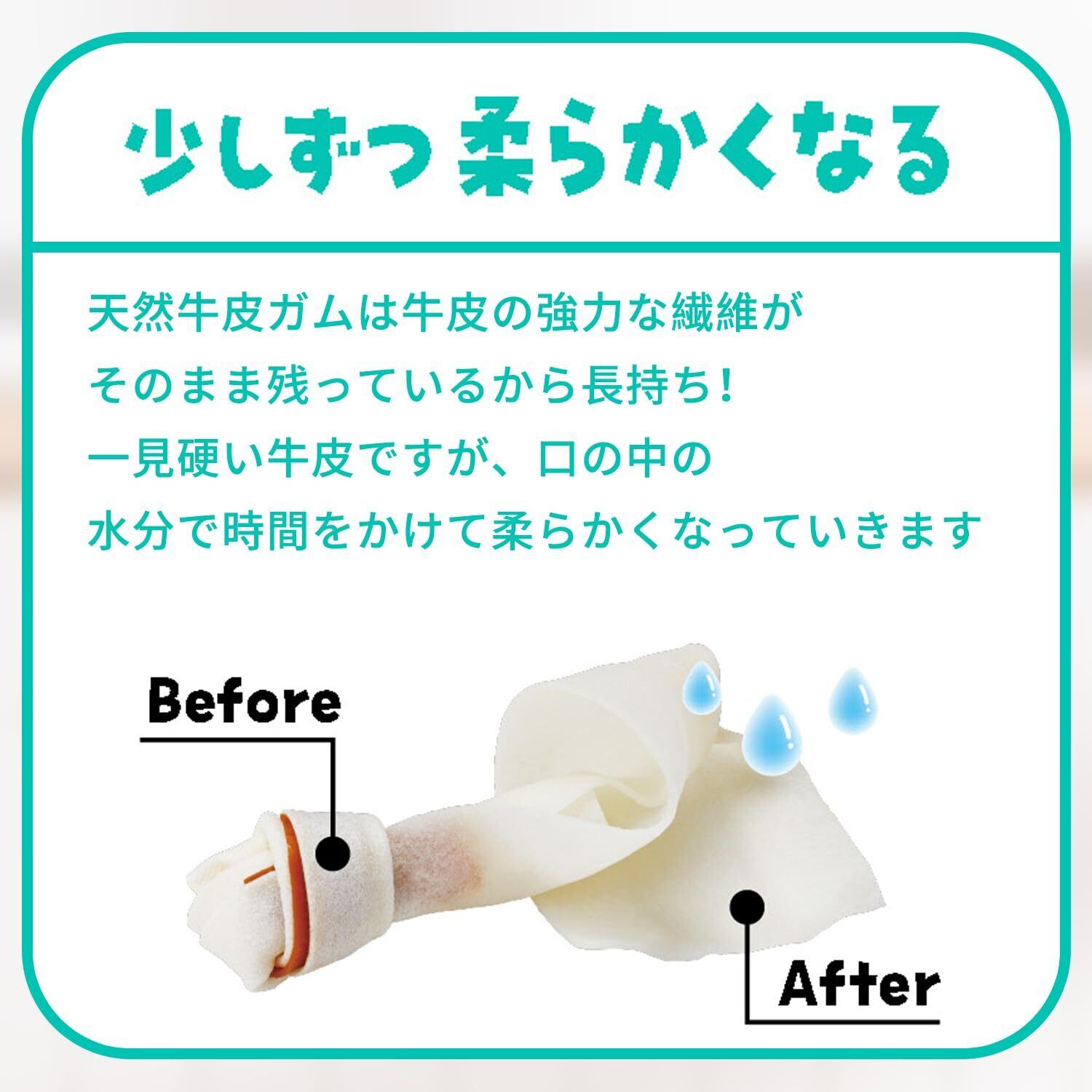 長持ち!天然牛皮ガム&ササミ 噛むことでデンタルケア ・天然牛皮は牛皮の強力な繊維がそのまま残っているから長持ち!さらに、噛んでいるうちに口の中の水分で柔らかくなっていくから硬すぎない。 ・ミネラル成分SHMP・パセリシードオイル配合。噛むことで歯垢を除去。 ・硬さレベル:3(硬い) ・保存料・着色料・香料・発色剤 無添加 ・オリゴ糖 配合 ・農水省認定工場製造
