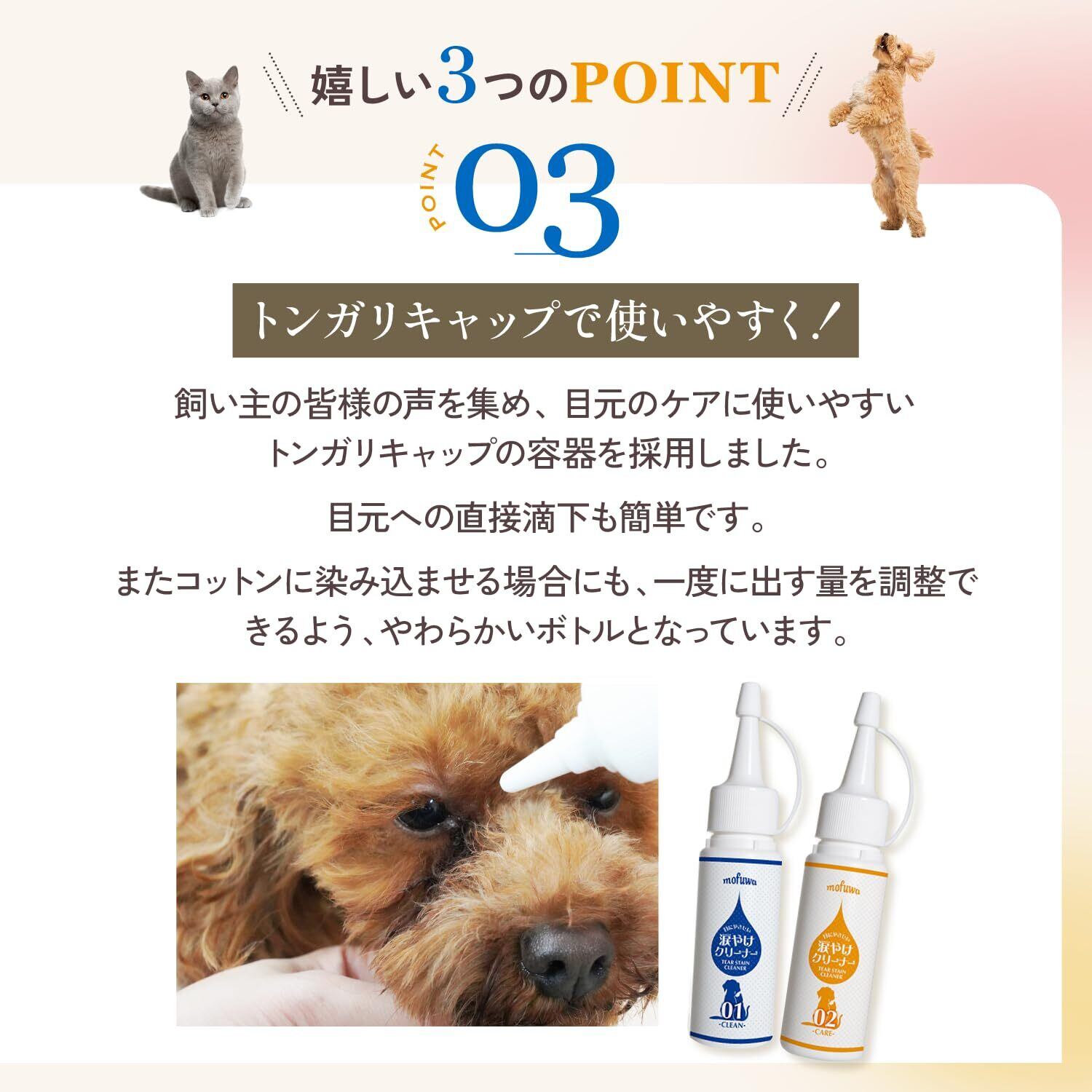 【涙やけの汚れとニオイにWアプローチ】涙やけは、①涙に含まれる「油分汚れの沈着」と②「菌の繁殖」の2つにより引き起こされることが一般的です。【mofuwa目にやさしい涙やけクリーナー】は、01液、02液の2本セットの商品となっており、①「油分汚れによる沈着」を01液が、②「菌の繁殖」を02液がそれぞれ解決することで、涙やけの原因にWアプローチします。