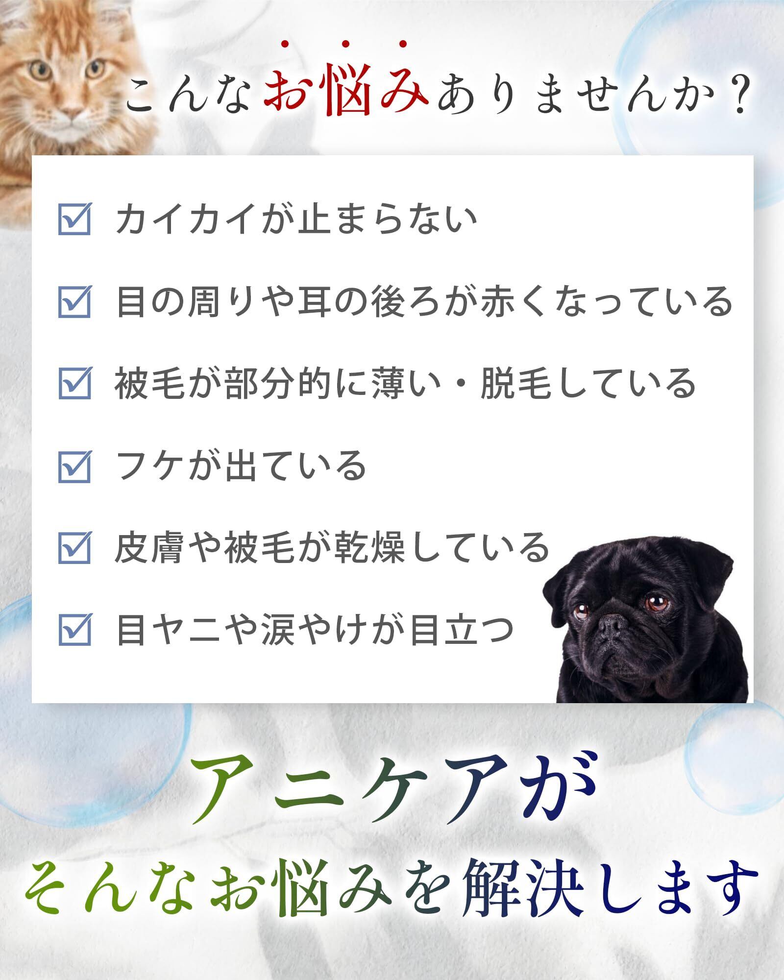 【 皮膚・被毛・肉球・涙やけまでトータルケア】 かゆみ・乾燥・フケなどの皮膚トラブルだけでなく、肉球のひび割れや被毛のパサつき、さらには目ヤニや涙やけなど、1本であらゆる悩みに対応できるオールインワンミストです。日々のグルーミングの一環としても、トラブルが出はじめた時の初期ケアとしても大活躍します。