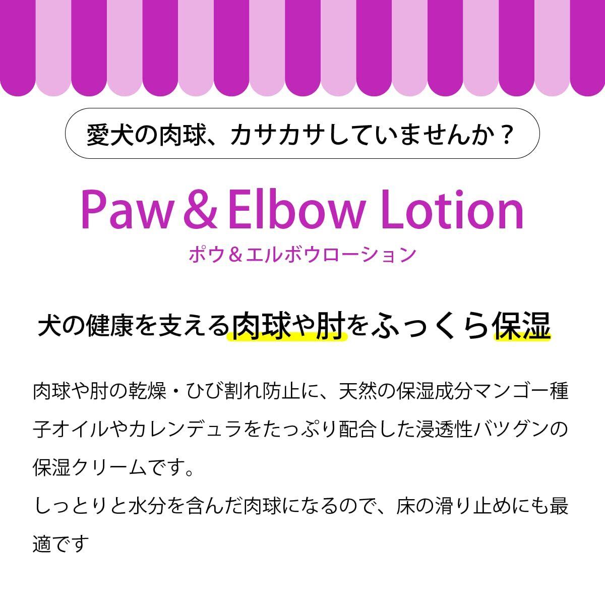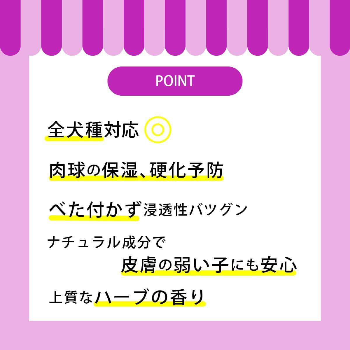 【肉球ケアクリーム】肉球や肘を保湿・保水し、コンディションを整え、快適に保つためのローションには、天然の保湿成分マカダミアナッツオイルやマンゴー種子オイルをたっぷり配合。浸透性が高く、つけた後はしっとりと水分を含んだ肉球になるので、床の滑り止めにも最適です。ベタつかず、やさしい保湿成分なので、お腹など被毛の薄い部分への使用もオススメです。