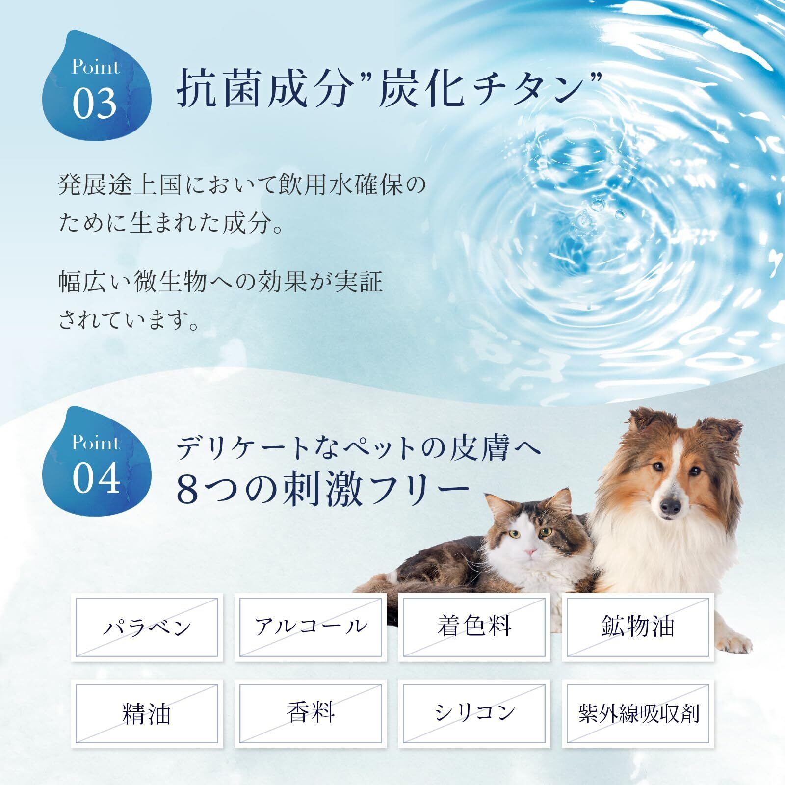 舐めてしまってもOK|ワンちゃん、ネコちゃんが舐めても影響のない成分を使用。アルコール、添加物、保存料、着色料の4つを不使用で、小型犬からシニア犬まで対応。