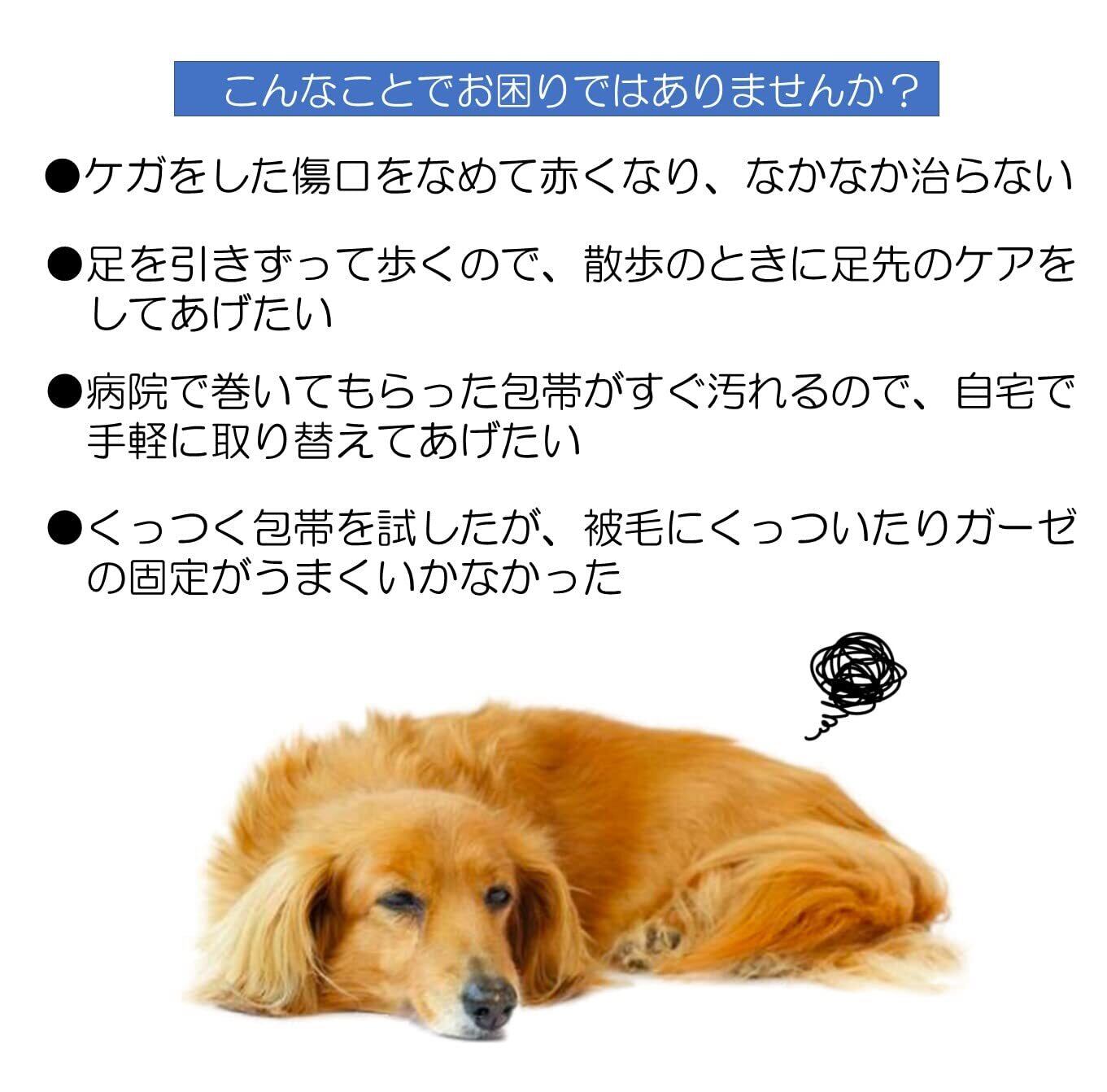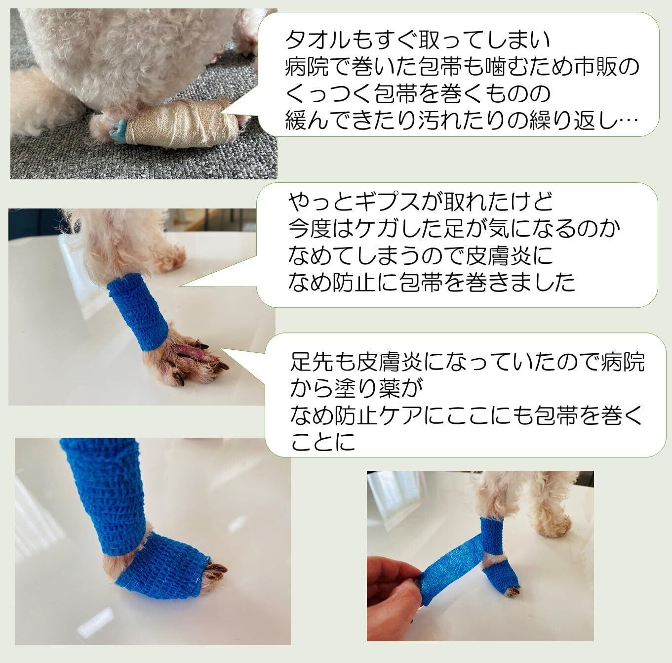 ペット介護士である店長が、販売前にケガをした当ショップモデル犬にも試しに使用してみました。 最初は気になるようで包帯をガシガシと噛んでいましたが、噛んでも破れたり剝がれたりすることがありませんでした。(※噛む頻度などにより個犬差があります)