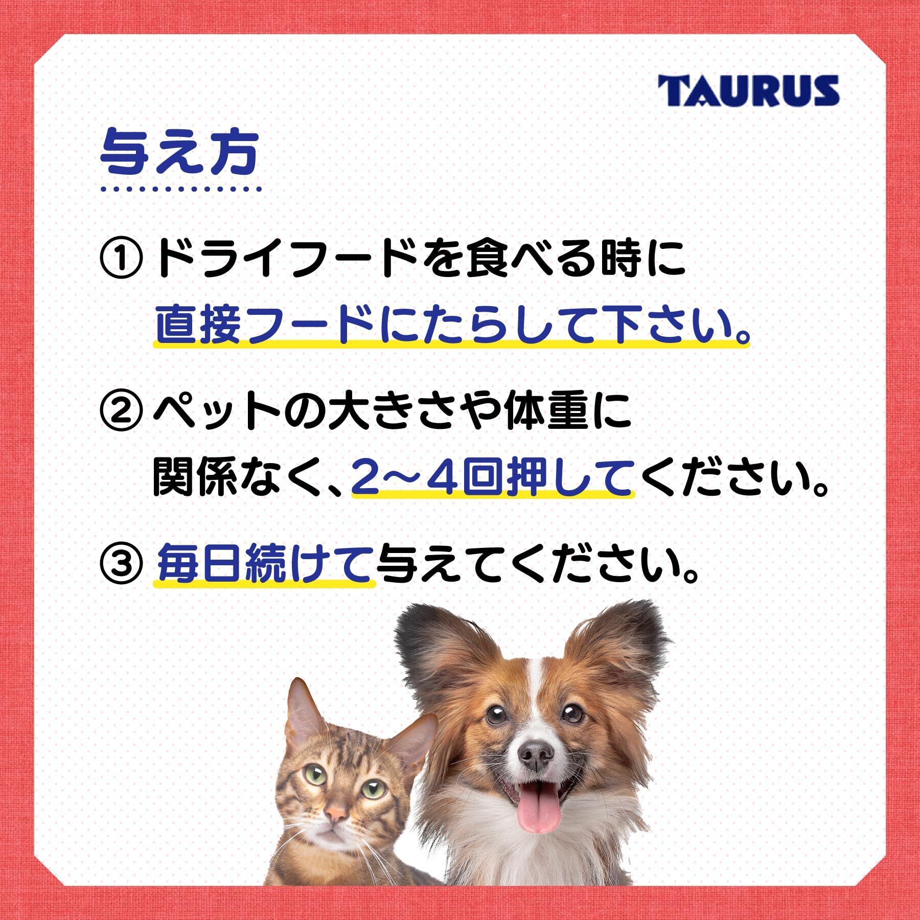 ドライフードを与える時に直接かけて下さい。軽く2~4回押して下さい。(大きさ、年齢、体重に関係ありません)。毎日続けて与えて下さい。