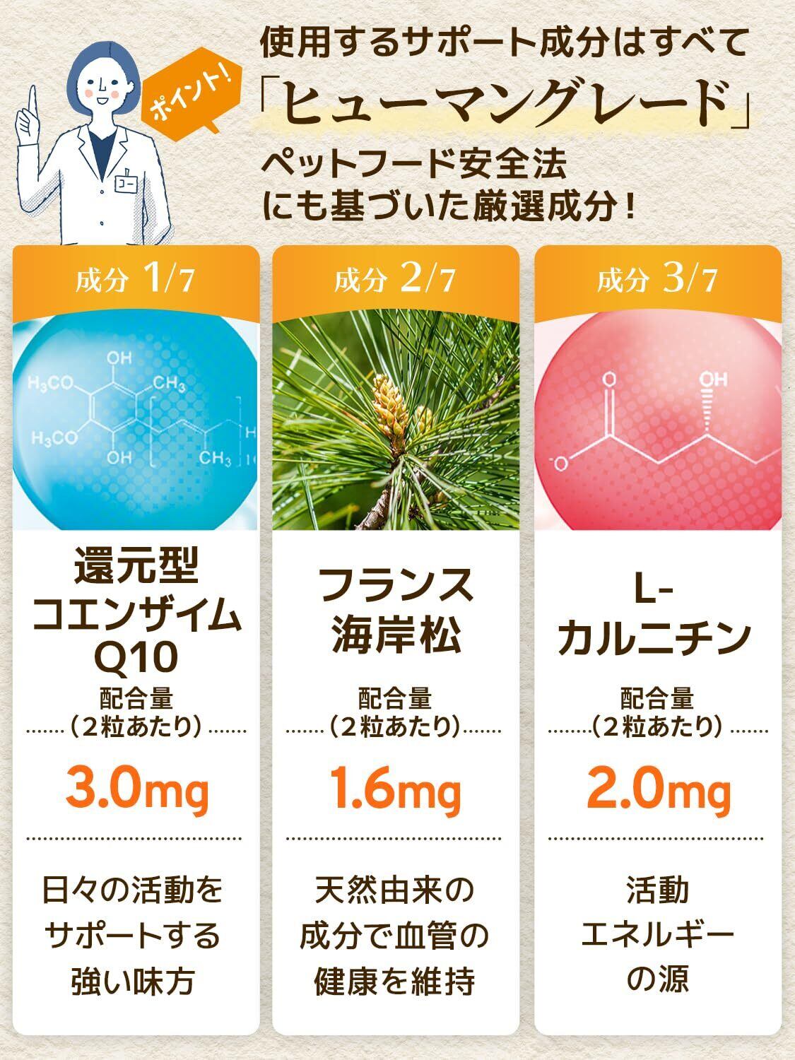 【成分配合量の表示】ウィズペティは原材料の表示だけではなく主成分の成分配合量も表示しております。大切な愛犬が口にするペットサプリメントを正しくご理解いただき長くご愛用頂く事が大切だと考えます。[犬用サプリ・心臓の健康維持:毎日健心 コエンザイムQ10&フランス海岸松 2粒あたりの主成分配合量/還元型コエンザイムQ10 3.0mg、フランス海岸松 1.6mg、L-カルニチン 2.0mg、L-シトルリン 3.0mg、ルンブルクス 1.0mg、ゴマエキス 0.1mg、タウリン抽出物 2.0mg]