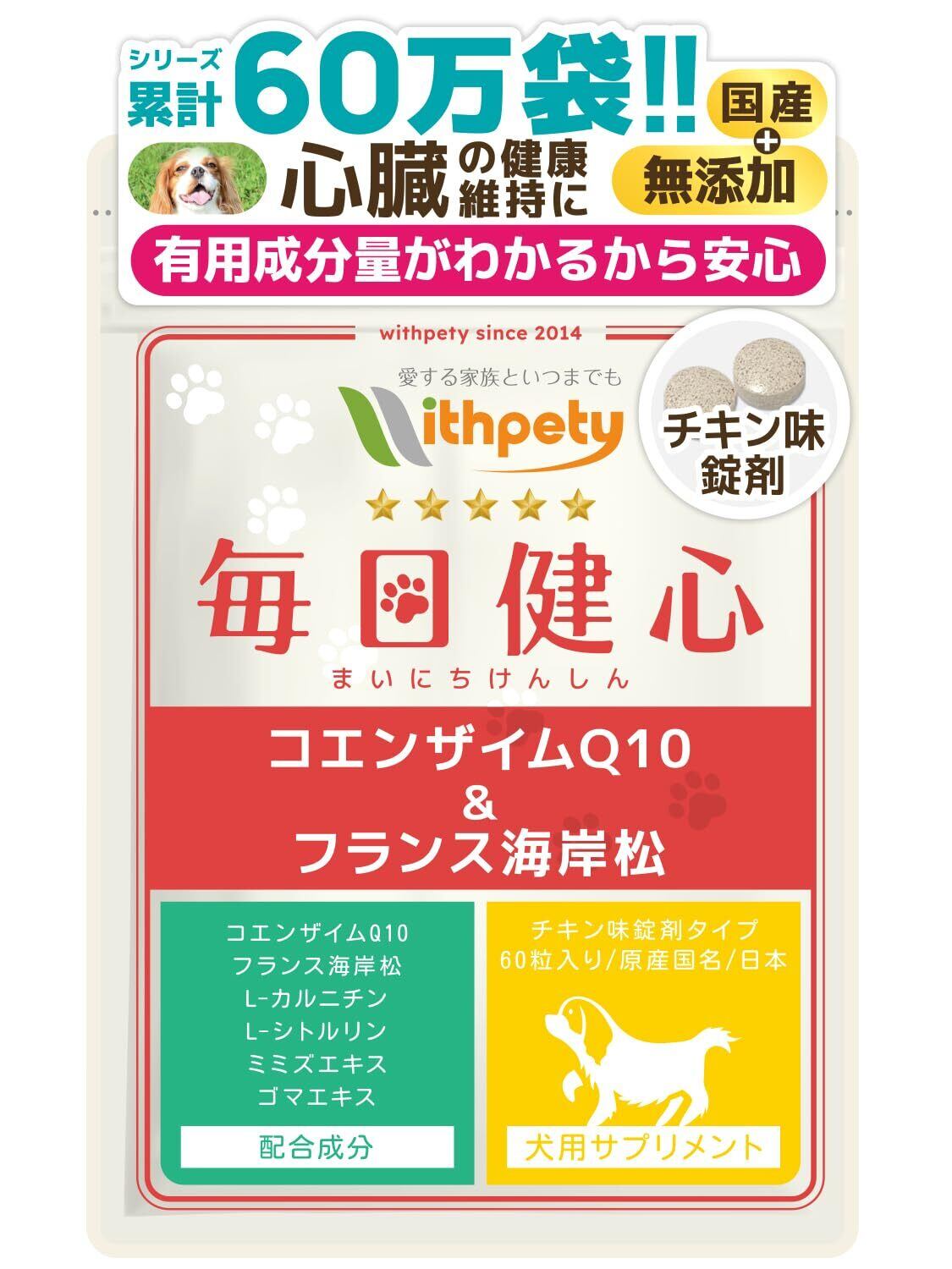 毎日健心 犬 心臓ケア サプリ 国産 無添加 成分量明記【7成分配合】 還元型コエンザイムQ10 フランス海岸松 L-シトルリン L-カルニチン ルンブルクス末 ゴマエキス タウリン 咳 咳止め <チキン味錠剤 犬用 サプリメント 1袋60粒入>[ウィズペティ公式]
