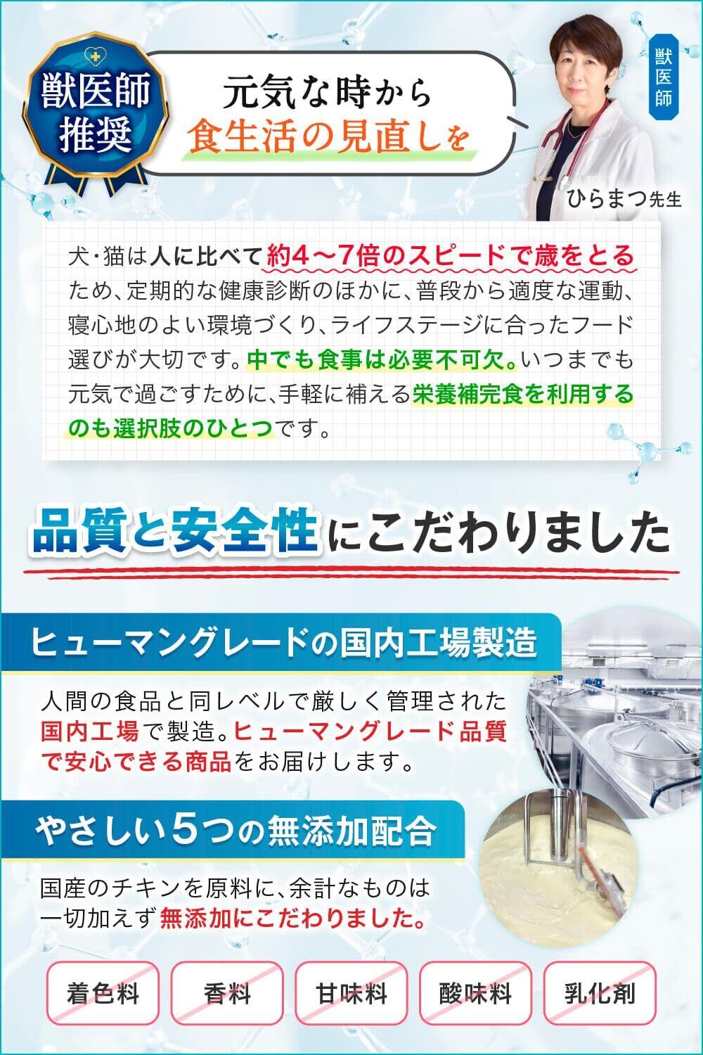大切な家族が食べるものだから品質と安全性にこだわりました。余計なものは一切加えない 無添加 製造人間用の食品と同じレベルで原料や品質を厳しく管理した国内工場で製造された ヒューマングレード 商品です
