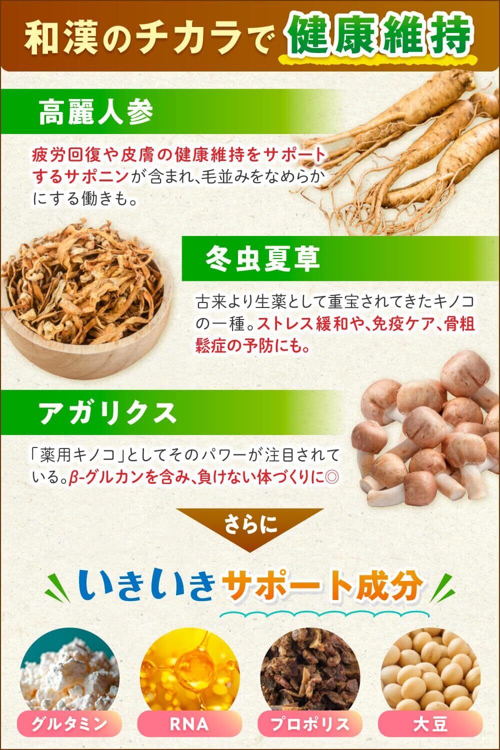漢方として用いられ 疲労回復 や 皮膚 の 健康維持 をサポートする 高麗人参 、古来より生薬として重宝されてきた 冬虫夏草 、「薬用キノコ」ともいわれる アガリクス 、胃腸の保護や 筋肉 づくりに役立つ グルタミン 、疲れがたまりにくい体をつくる RNA ( 酵母 リボ核酸 )、炎症を抑える働きがあるといわれる プロポリス 、 老化予防 の 大豆 など、元気な時から摂りたいイキイキ成分でいつまでも 健康 に