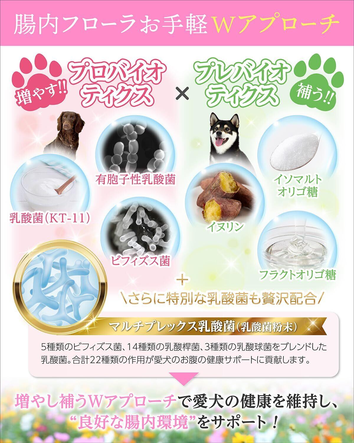 【獣医師監修:お腹の健康ケア】お腹や身体の調子が心配なワンちゃんの為に開発された、"獣医師監修"チキン&かつおMIX味の「24種の乳酸菌」サプリ。